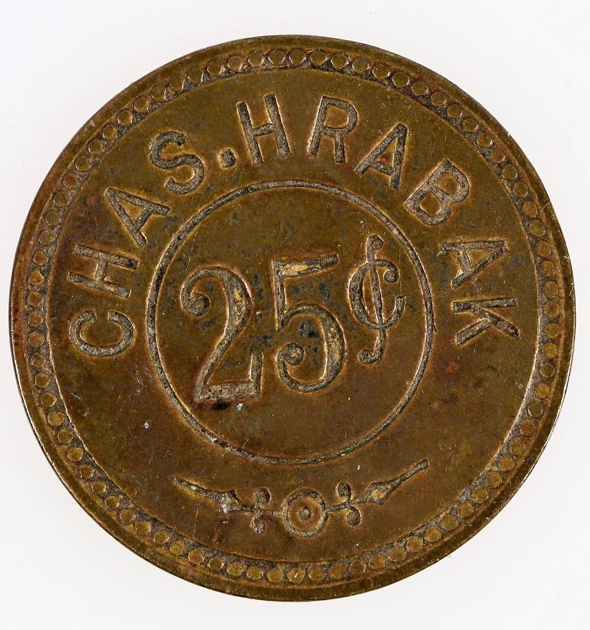 CHAS. HRABAK / 25c (all incuse) // (blank); Br. rd., 25 mm. Charles Hrabak ran a general store 1900-1917.