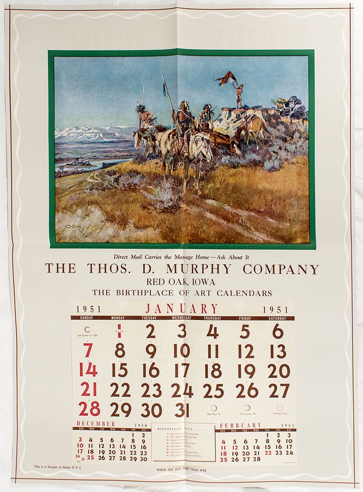 c1951 This is a 32"x 42" calendar broadside from Murphy & Company. The head piece features a print by Charles Russell titled "When the Red Man Talks War." This is in very good condition. - HKA#65953