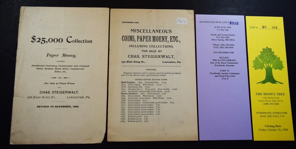 (1) Chas. Steigerwalt, List No. 65C, November 1905, LNN, 12 pages, paper covers once folded, unplated, very good, U.S. coins, 1794 cents, New Jersey cents, Broken Bank bills, English tokens, Foreign copper coins, Hard Times tokens, medals, ex Katen Sale No. 81 Lot 2809, ex Money Tree Sale No. 30 Lot 904.