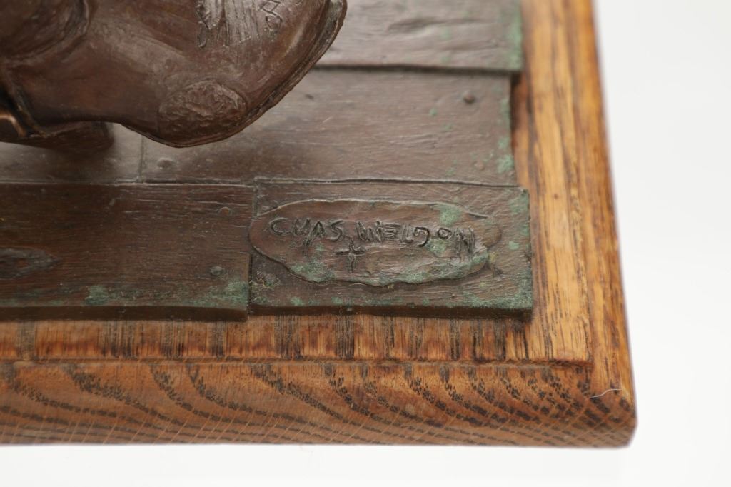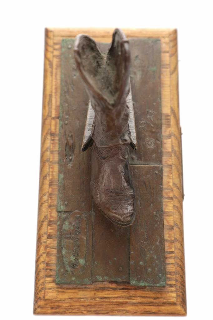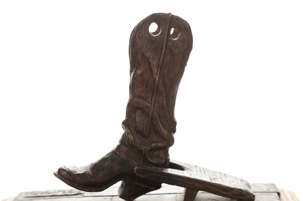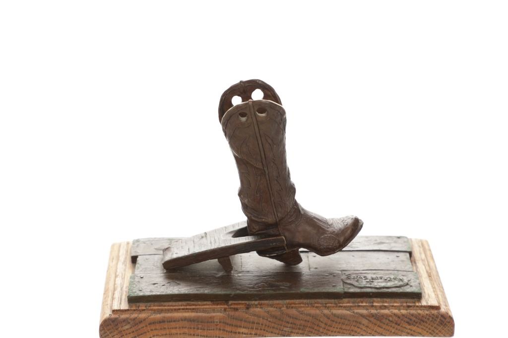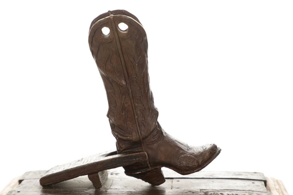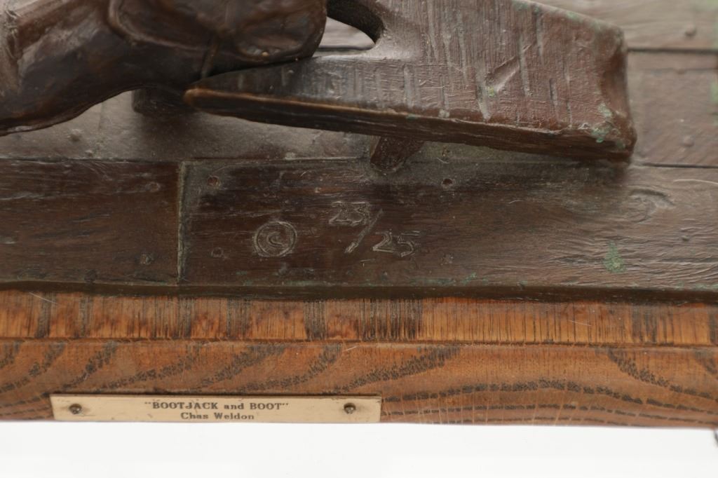 Featured in this lot is this bronze sculpture called "Bootjack and Boot," by artist Chas Weldon. The bronze features a wonderfully and professionally crafted bronze construction that features the bronze mounted on a hardwood shield that shows a scene of a high top pair of boots propped inside the crook of a bootjack. The bronze is signed "Chas Weldon" and is numbered 23/25 and shows a plaque on the front that reads: "Bootjack and Boot" Chas Weldon. Chas Weldon is a notable saddlemaker that made saddles for iconic legendary horsemen such as Buck Brannaman. The condition of this bronze sculpture is good with no obvious signs of damage and shows good overall condition. The measurements of this bronze sculpture is 7" x 9 1/2" x 4 1/2".