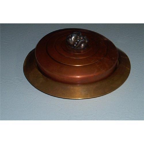 Beautiful Chase copper outside lid and bottom. The lid has a nickel fruit design handle. The glass 3-division glass relish tray appears to have been made by Imperial Glass. The bottom shows the "CHASE" Emblem and "CHASE" inscribed. The glass relish tray measures: 5 1/4 inches in diameter and 1 1/4 inches deep. The Chase Copper outside measures 8 inches in diameter including the outside rim. Excellent condition.