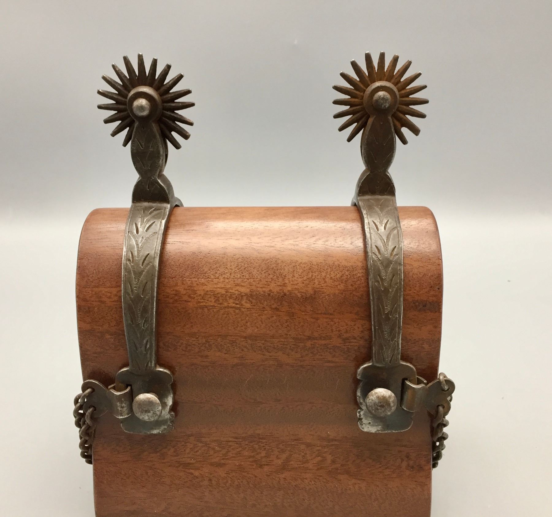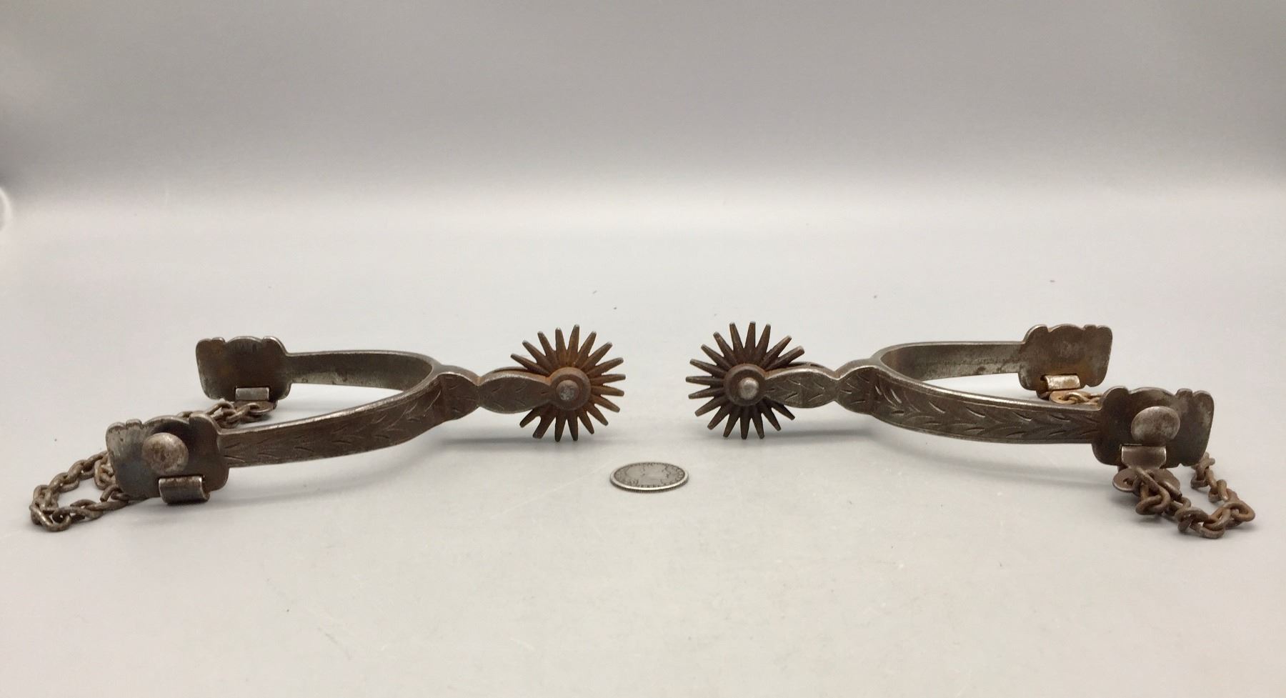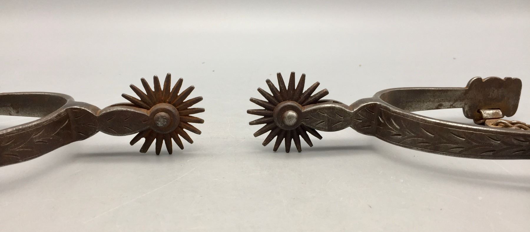 Description: Offered in this lot is a nice pair of Buermann spurs with chased "etched" design on the outer heel bands.
