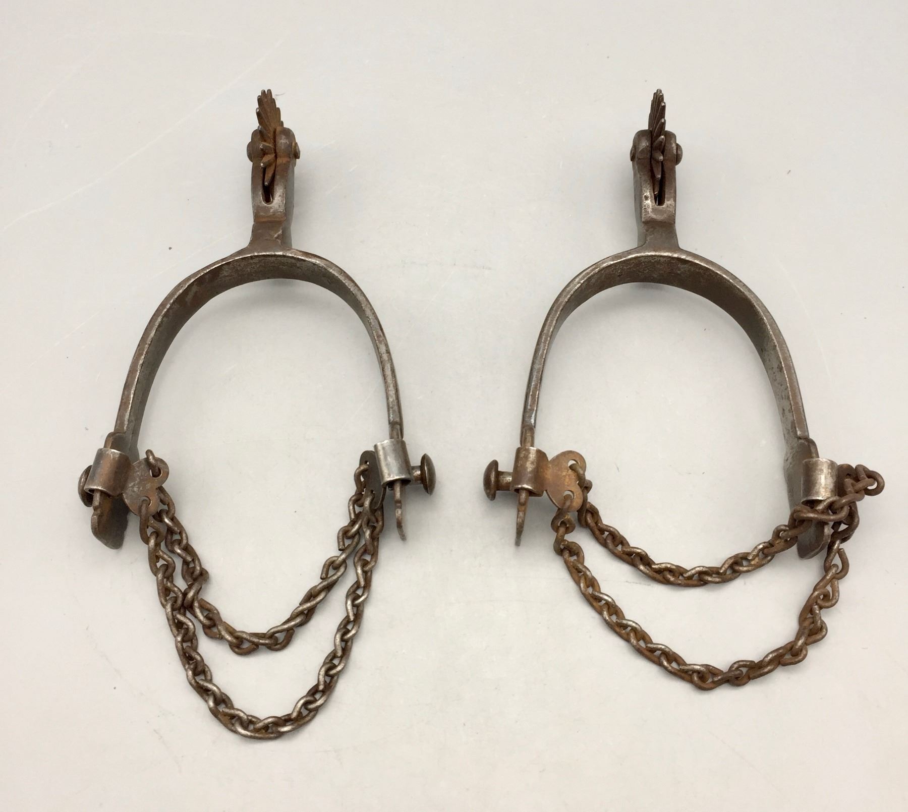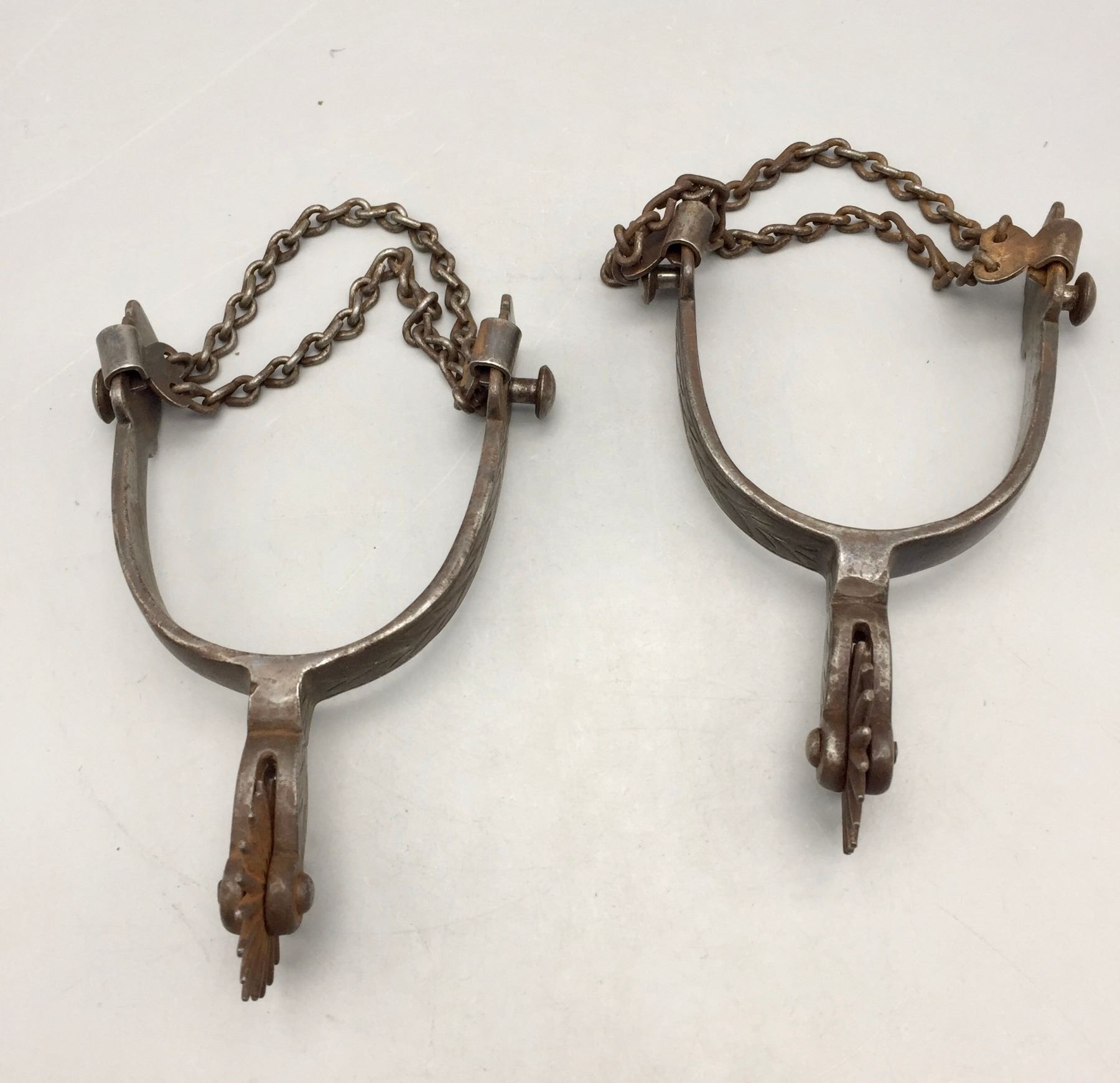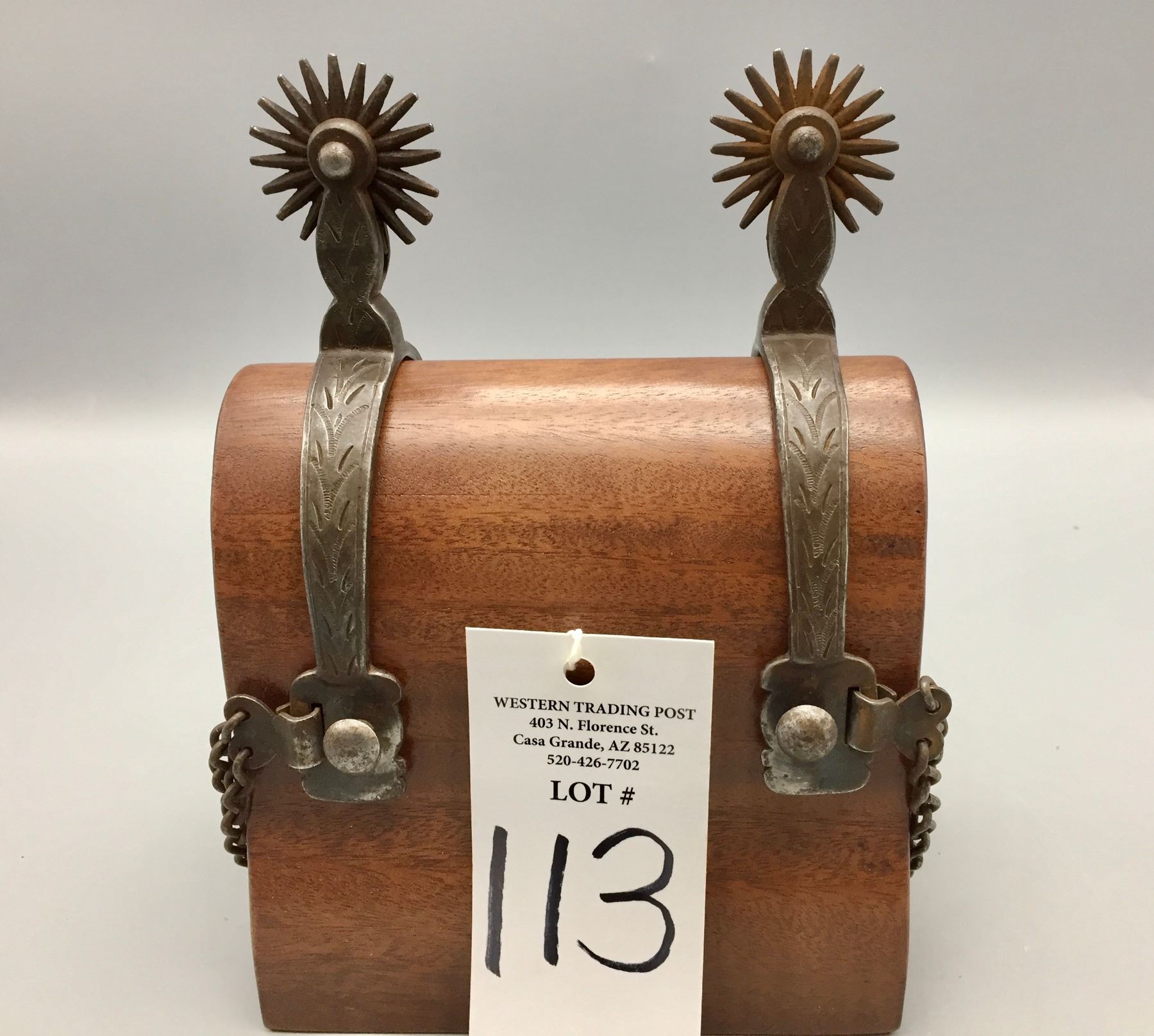 Description: Offered in this lot is a nice pair of Buermann spurs with chased "etched" design on the outer heel bands.