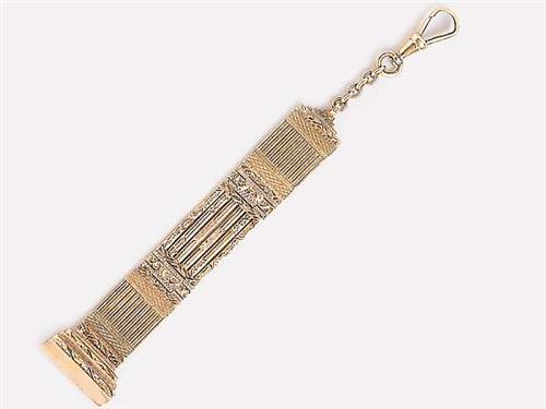 14 K gold, 3 hinged parts, guilloche and engraved decoration, short chain with ring and staple, Pest, circa 1930, marked, weight: 12.0 g, in good condition.