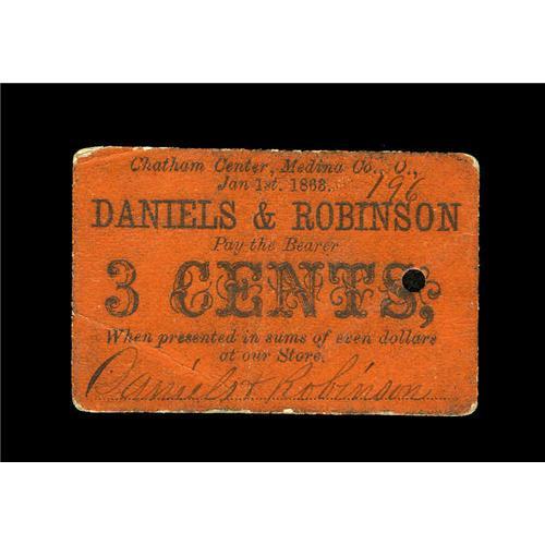 <B>Chatham Center, OH- Daniels & Robinson</B></I> 3¢ Jan. 1, 1863 Wolka UNL<BR>Both this town, a miniscule spot in the road in Medina County, and this issuer are unlisted in the estimable new Wolka Ohio reference. <B>Fine</B></I> with one POC, printed on orange cardboard.