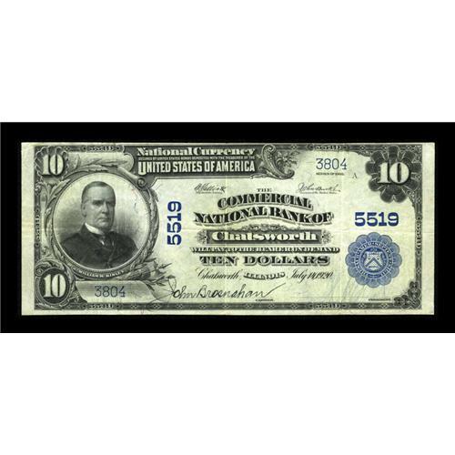 <B>Chatsworth, IL</B></I> - $10 1902 Plain Back Fr. 633 <B>The Commercial NB</B></I> Ch. # 5519<BR>Auction appearances of notes from here are measured in years. Cashier John Brosnahan's signature captures your attention on this bright and crisp piece from Livingston County. <B>Very Fine-Extremely Fine.</B></I><BR><I>From The Lincoln Collection</B></I><BR><BR><b>Shipping:</b> Coins & Currency (<a target="_blank" href="http://www.heritageauctions.com/common/shipping.php">view shipping information</a>)