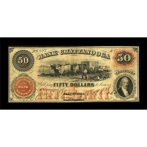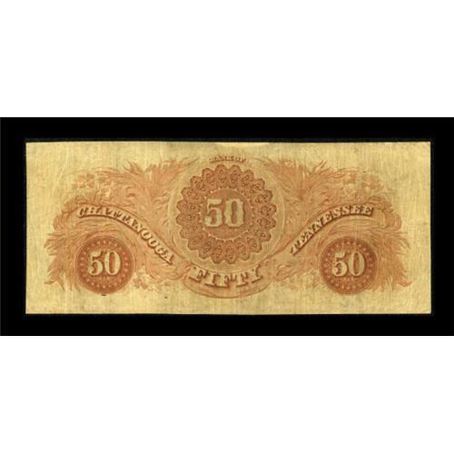 <B>Chattanooga, TN- Bank of Chattanooga</B></I> $50 Oct. 1, 1860 G58a Garland 112<BR> A tough high denomination example with an attractive red-orange overprint. Attractive <B>Fine-Very Fine.</B></I><BR><I>From The Collection of a Louisiana Gentleman.</B></I><BR><BR><b>Shipping:</b> Coins & Currency (<a target="_blank" href="http://www.heritageauctions.com/common/shipping.php">view shipping information</a>)