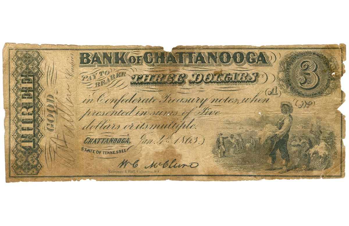 Chattanooga, Tennessee Bank of Chattanooga $3 Note. Jan. 4, 1863.