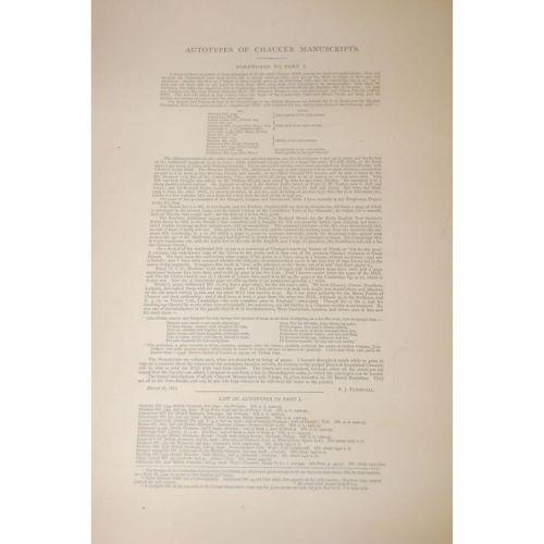 Chaucer. Autotypes of Chaucer Manuscripts. Chaucer Society, 1877. Elephant Folio - over 15" - 23" tall. Hard Cover. Ex-Library. Good Condition. 29 b/w plates, with a forward to part 1 (page 1). Unbound as issued, in a folding portfolio with ties. Occasional foxing.