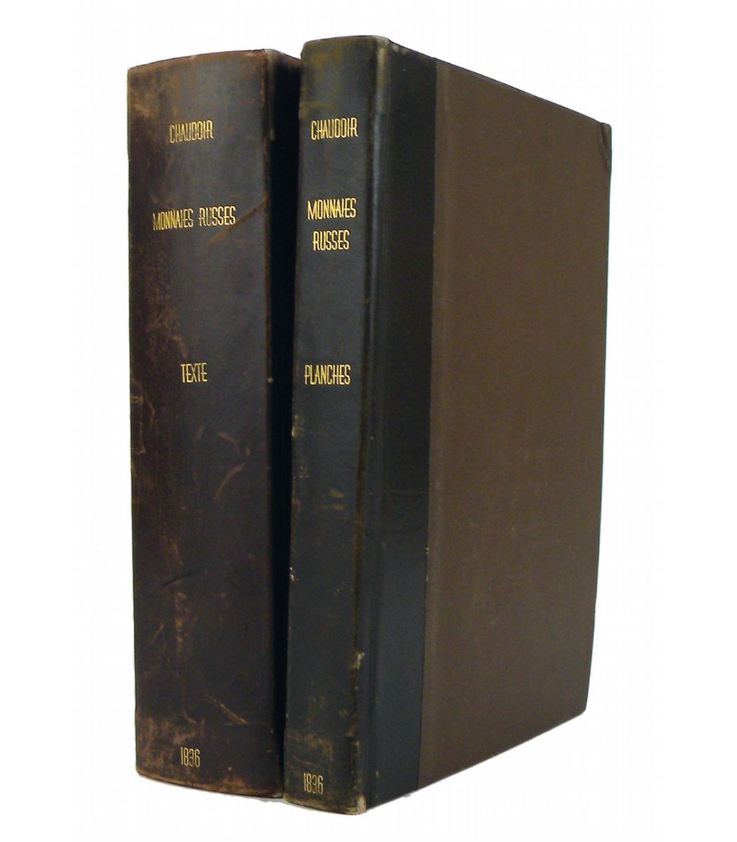 Chaudoir, Baron S. de. APERÇU SUR LES MONNAIES RUSSES ET SUR LES MONNAIES ÉTRANGÈRES QUI ONT EU COURS EN RUSSE. St. Petersbourg, 1836-37. Three volumes, complete, bound in two. 8vo, twentieth-century brown quarter baby calf, gilt. vii, (1), 266, (2); (4), xii, 331, (7); 23, (1) pages; 23 & 58 engraved tables and plates of coins. Bindings worn at spine, but sound; very good or better. The classic work; the first general guide to Russian coins. Infrequently encountered with the second volume of text published in 1837 (present here). Volume I recounts the history of the Russian monetary system and features an extensive bibliography. The second volume of text consists of detailed coin descriptions and the plate volume, beyond its numerous illustrations of coins, features tables of metal production, mintages, etc. The work gained for the author the Grand Demidoff Prize of 5000 rubles. Clain-Stefanelli 11138*. Grierson 194: "Encore utile, en dépit de sa date." Gromachevskii 392а.