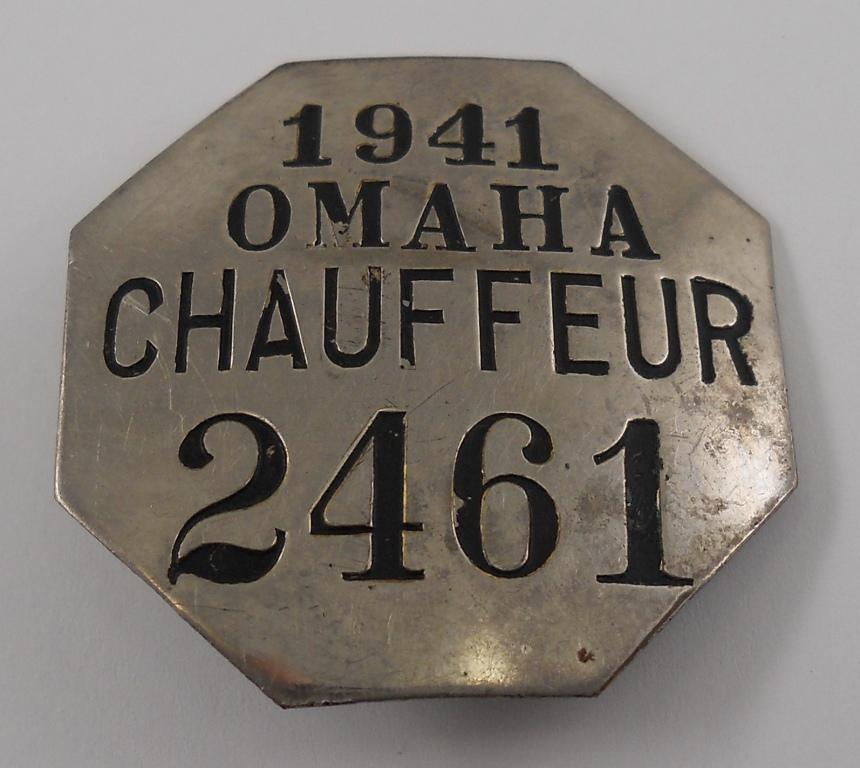 This is a well-made 1941 Omaha, Nebraska, Chauffeurs Badge number "2461." Its size is 1-3/4 inches x 1-¾ inches. It is made of nickel or nickel-plated brass and is in nice original condition.