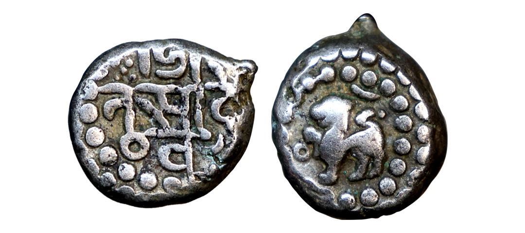Chauhans Of Ranthambor, King Jaitra Simha (c. 1275 AD), Silver Dramma, 5.05 gms, Obv. Lion standing left, forepaw raised; flanked by sun and moon Rev. Nagari legend Jai/ta Si de/va; all within a circle of dots, Deyell # 366, very fine+, scarce.
