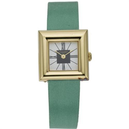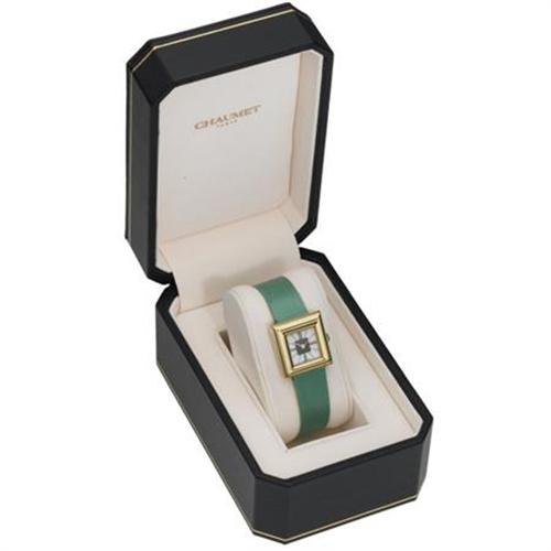 <B>Chaumet Lady's Vermeil Sterling Silver, Satin Strap Wristwatch</B></I><BR><BR>Case: 24mm, square-shaped case, vermeil sterling silver, stamped CC 743<BR>Dial: Matte white with black Roman numerals with goldtone hour indexes, complete with a quartz crystal<BR>Movement: 7 jewels, Swiss quartz.<BR>Bracelet: Green Satin Strap with vermeil accented buckle.<BR>Signed: Triple signed Chaumet on the dial, case and clasp. <BR>Notes: Accompanied by a Chaumet signed, fitted box.<BR><I>*The Property of Sharon Bush</B></I><BR><BR><b>Shipping:</b> Miscellaneous Collectibles, Smal (<a target="_blank" href="http://www.heritageauctions.com/common/shipping.php">view shipping information</a>)