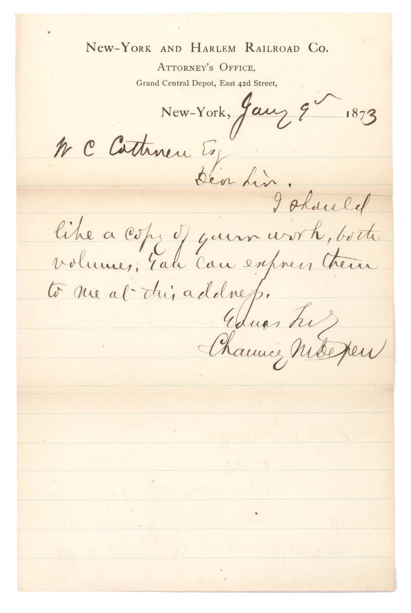Chauncey M. Depew. (1834-1928). United States Senator from New York. Autograph Letter Signed, “Chauncey M. Depew,” on New-York and Harlem Railroad Co. Attorney’s Office, Grand Central Depot, East 42nd Street letterhead. One page, 5 ½” x 8 ½”. New York. January 17, 1873. Depew writes to request a copy of a two volume work be sent to him via express. Extremely Fine.