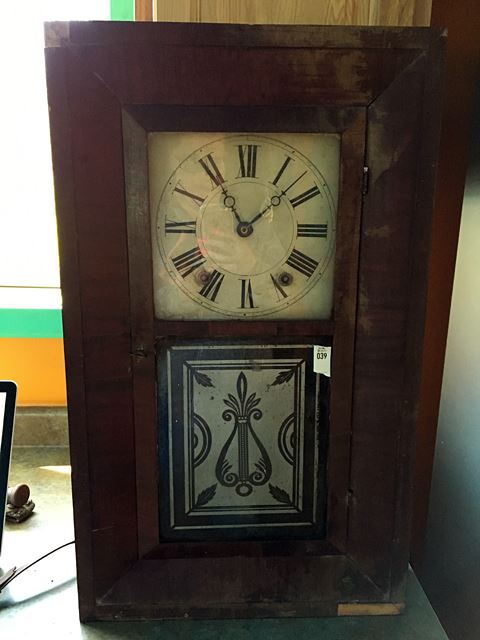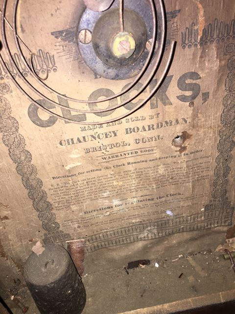 Chauncey Boardman, Bristol CT wooden works OG shelf clock with original glass with harp filagree, nice label. This lot can be picked up in Woodbury CT for local buyers, or our shipper can pick up and ship to your location.