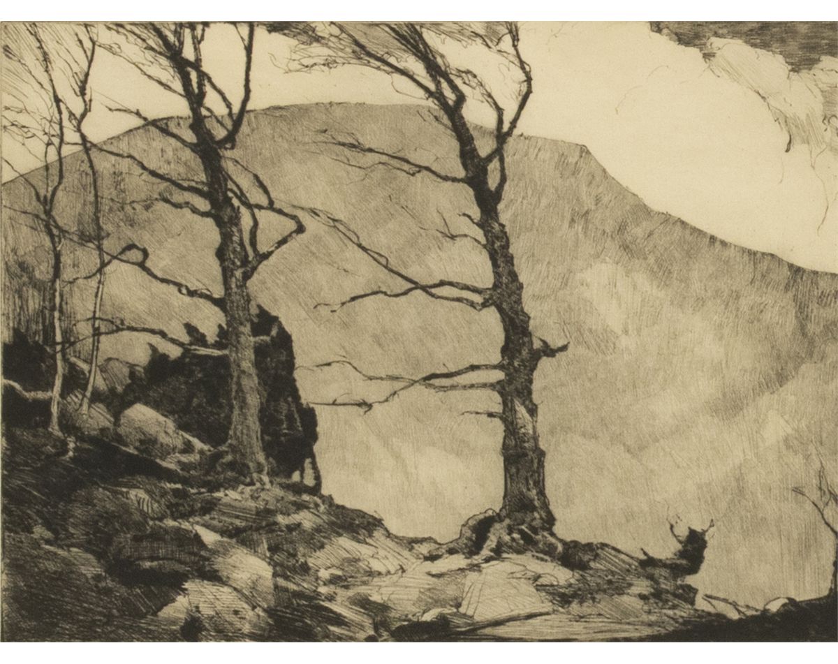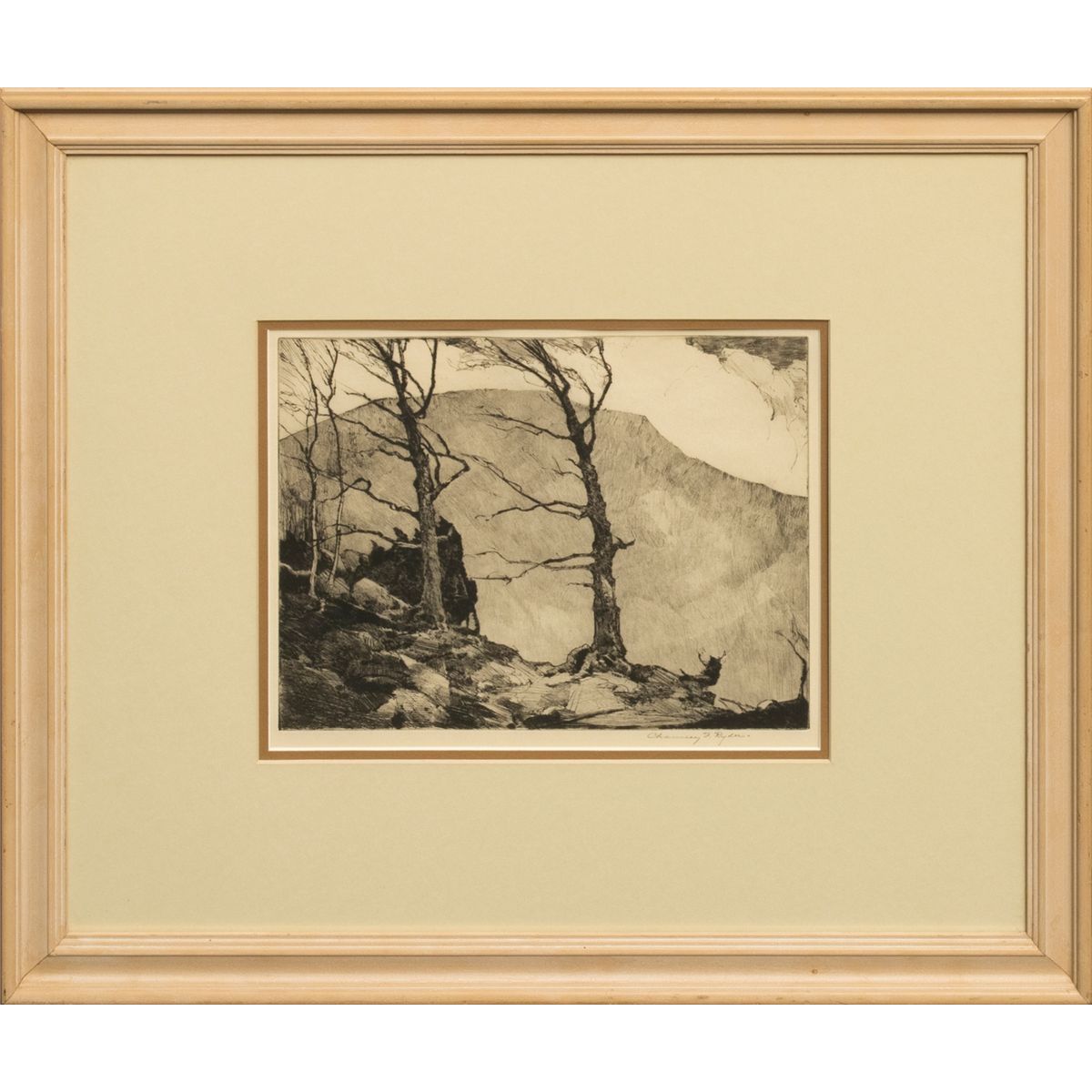 Chauncey Foster Ryder (1868 - 1949). Windswept Trees. 8.75" x 11.75" etching. Signed lower right margin: Chauncey F. Ryder. Provenance: Bethany College, Lindsborg, KS.