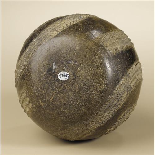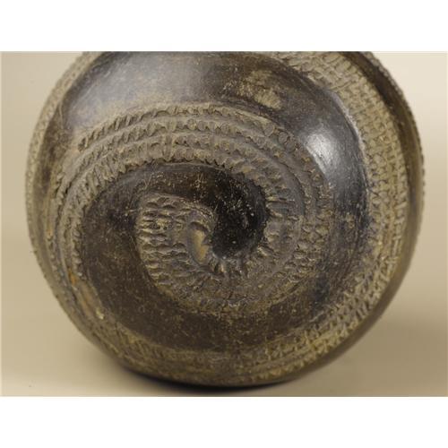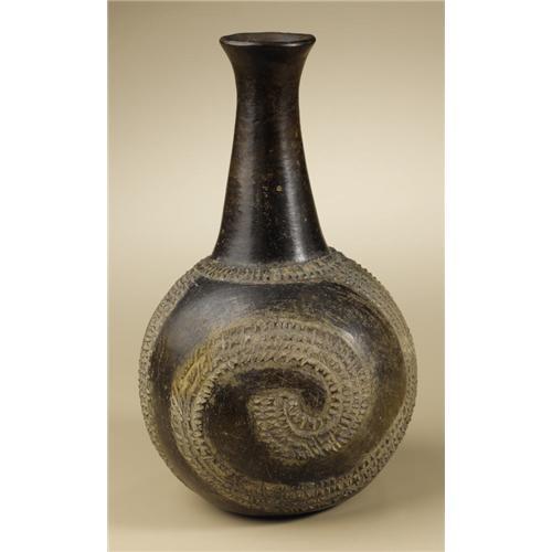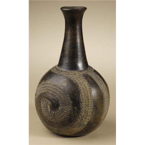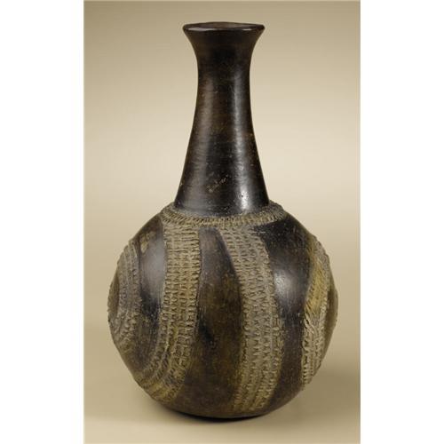 <B>Single-spout Bottle</B></I><BR>Chavín, Tembladera<BR>1000 - 600 B.C.<BR>Burnished and textured blackware<BR>Height 9 1/2 in. Diameter 5 3/4 in.<BR><BR>This vessel, which represents one standard Chavín ceramic shape, embodies the extraordinary technical perfection and elegance characteristic of this early culture. A further indication of Chavín sophistication is the way in which the textures of vessel surfaces are developed organically in harmony with shape to create a much more complex set of visual rhythms than might seem possible from the relatively few basic elements. The interaction of matte texture with reflective burnished areas adds a further level of visual activity. Overall condition is good, with minor patches near lip of spout, small areas of loss in the textured area of one spiral, and a few surface scratches.<BR><BR>Provenance<BR>David Bernstein, New York<BR><BR>