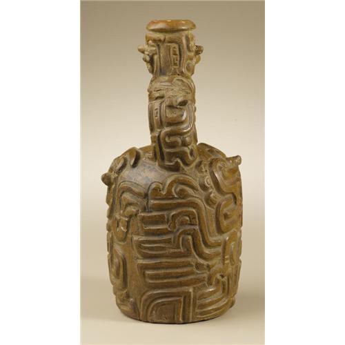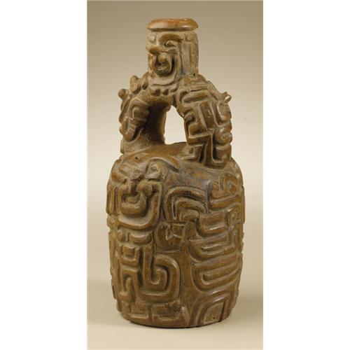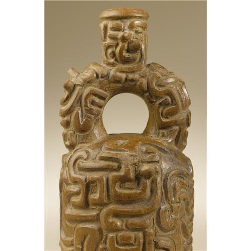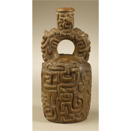 <B>Stirrup-spout Vessel</B></I><BR>Chavín, Tembladera<BR>1000 - 600 B.C.<BR>Carved and burnished brownware<BR>Height 9 3/4 in. Diameter 4 5/8 in.<BR><BR>The complex, densely-packed imagery of this exceptional vessel indicates that it was connected with the core of the Chavín belief system. Such vessels, along with equally portable painted textiles, were the primary means through which the Chavín cult was propagated across extensive geographic areas from the highland center of its development and elaboration, Chavín de Huántar. The dynamic carving of this vessel is integrally employed to signal the principal motif, a fanged avian raptor. Six pairs of fangs project sharply outward from the six appearances of this creature's head, two on the upper main vessel body, one on either side of the stirrup, and two on the short vertical spout. These fangs spatially differentiate the primary heads from two more large, differently-configured heads on the lower vessel body. Two carved wings are so situated that they are shared by all four large heads on the main vessel body. Such multiple interactions provide visual equivalents for the reiterative structure of most ritual texts. The overall condition is very good, with parts of three projecting fangs missing and minor chipping at the spout lip.<BR><BR>Provenance<BR>David Bernstein, New York<BR><BR>