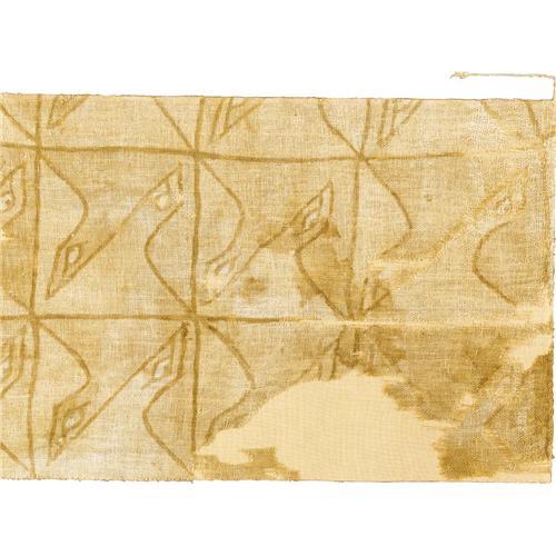 <B>Rectangular Cloth with Alternating Bird Heads</B></I><BR>Chavín<BR>800-400 B.C.<BR>Cotton fiber and pigment<BR>Length 26 1/2 in. Width 12 1/4 in.<BR><BR>The rarity of textiles with Chavín imagery gives each example importance. Almost all pieces that do survive are, as this one, painted with deft brushwork on finely woven cotton fabric. This textile is unusual among Chavín painted textiles in its general boldness and simplicity of abstract design, and in the arrangement of interlocked bird images within an overall grid. This latter element looks forward to of one mode of textile pattern organization which became key in many later weaving traditions. The simplified birds' heads have eyes like those also seen in Chavín snake representations. Since much Chavín iconography is filled with double - and even triple - level imagery, this resonance was almost certainly intentional. The original selvage is present, along with one braided corner tie. For a textile of this age the condition is as expected. It is mounted on a fine weave fabric which is in turn sewn to a stretched fabric.<BR><BR>Provenance<BR>Bonhams & Butterfields, San Francisco: sale 7437E, 9 June 2003, lot 5117, p.30<BR><BR>