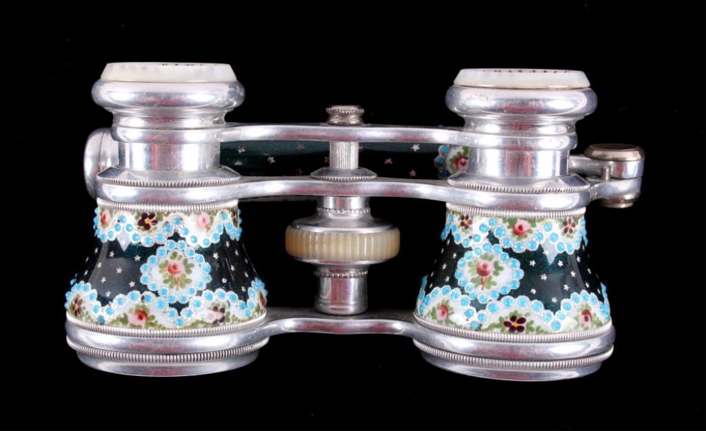 The lot features a set of French hand painted & enameled opera glasses from the Chavance & Co Paris. These are exceedingly rare opera glasses with a wonderful hand painted floral and star design. Signed on the eyepieces Chavance & Co. Paris. The rare set are from the 19th century. These have a very good condition for their age and also show the rare foldable handle. Measures with the handle down 4.5"x4 3/8"x2.25". Measures with the handle folded in 4 3/8"x2.25"x2.25". Marked on eye piece and also marked, "Made in France" and with a six pointed star with a 5 in the center. RARE.