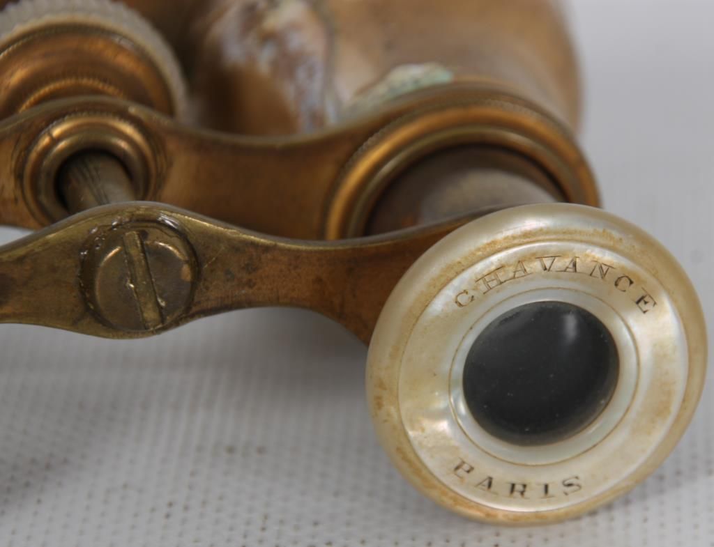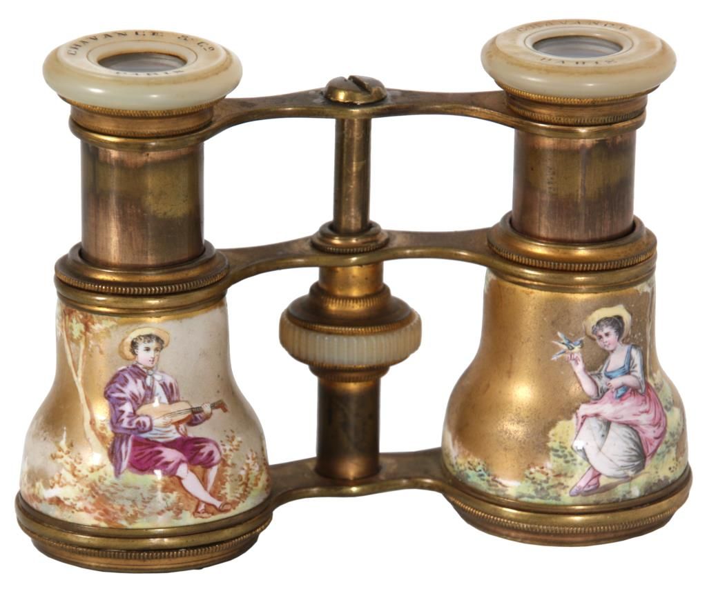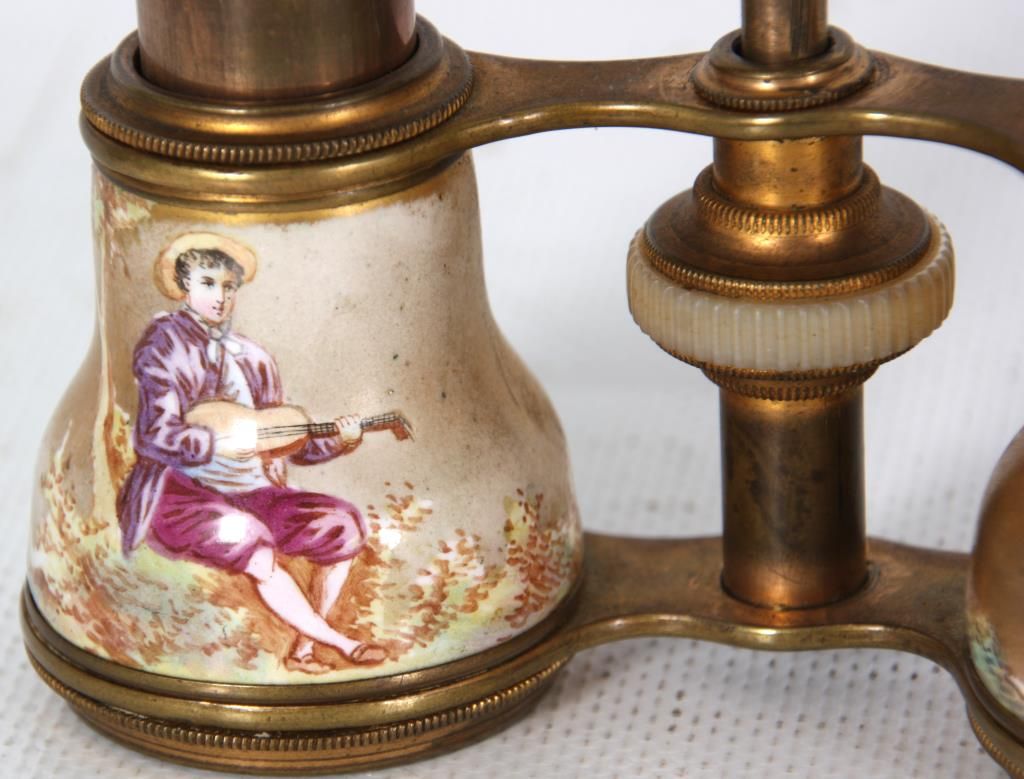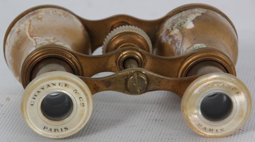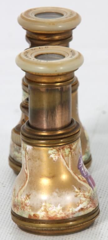 Chavance & Co. Paris Opera Glasses. Beautiful brass frames with pearlescent eyepieces and hand painted porcelain inserts on the barrels with a man and woman seated in a forest on a gold background. Signed on the eyepieces Chavance & Co. Paris. In very good condition with no cracks or chips to the porcelain, the lenses are clean and clear with no cracks or chips. 2.5 in. high x 4 in. wide x 1.25 in. dia.
