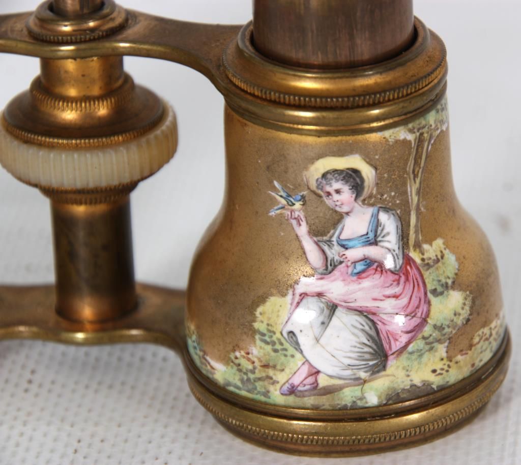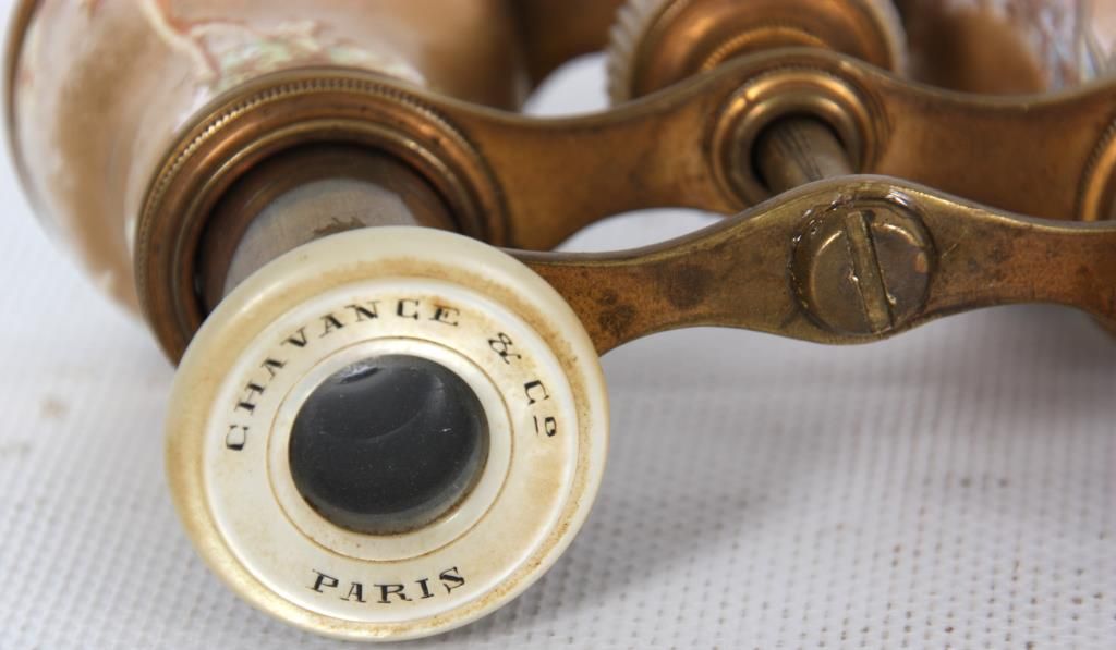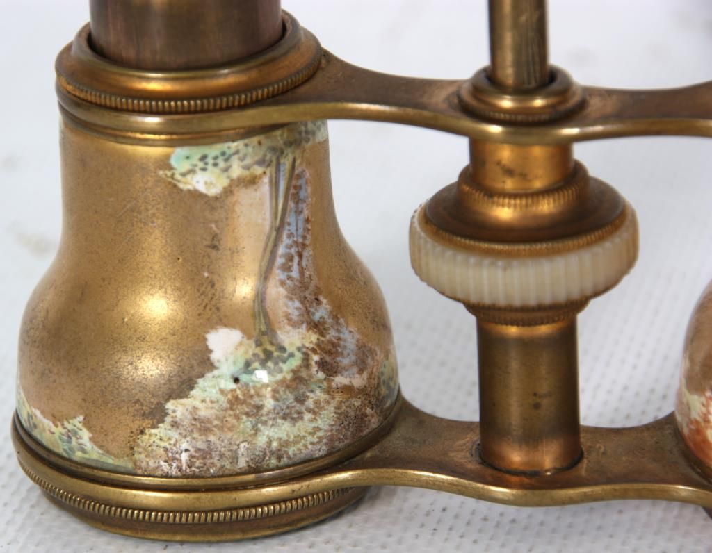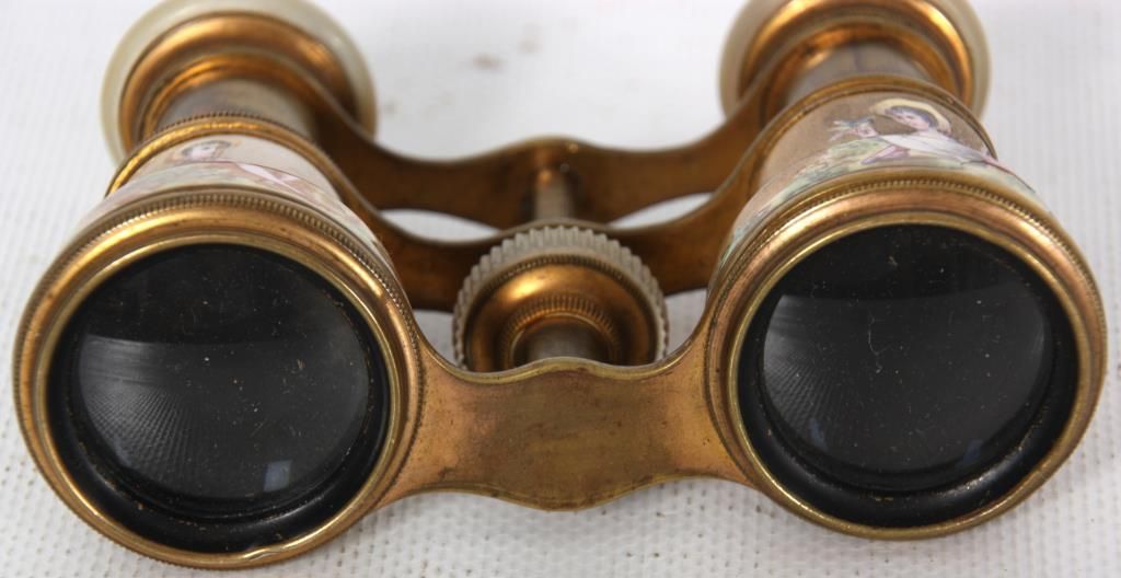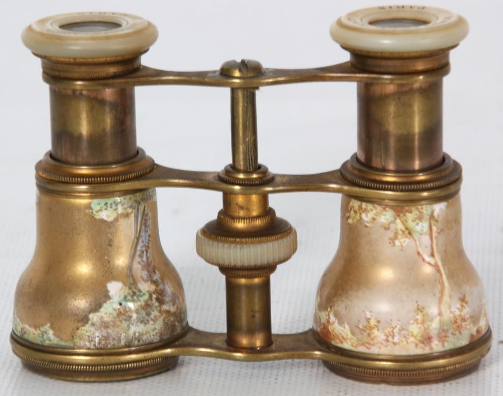 Chavance & Co. Paris Opera Glasses. Beautiful brass frames with pearlescent eyepieces and hand painted porcelain inserts on the barrels with a man and woman seated in a forest on a gold background. Signed on the eyepieces Chavance & Co. Paris. In very good condition with no cracks or chips to the porcelain, the lenses are clean and clear with no cracks or chips. 2.5 in. high x 4 in. wide x 1.25 in. dia.