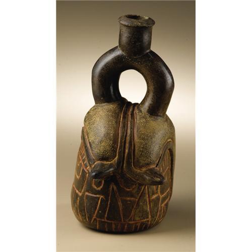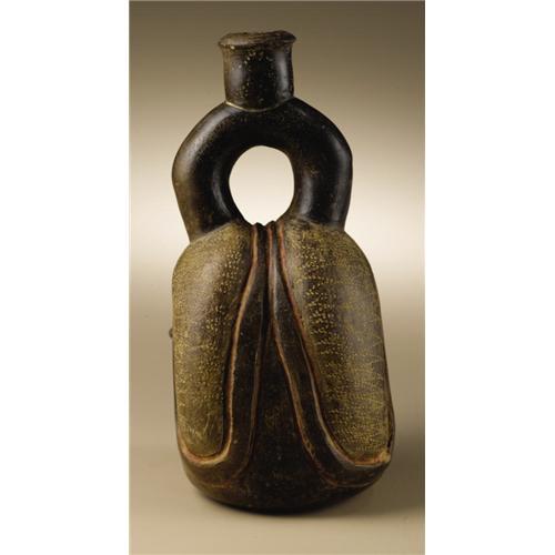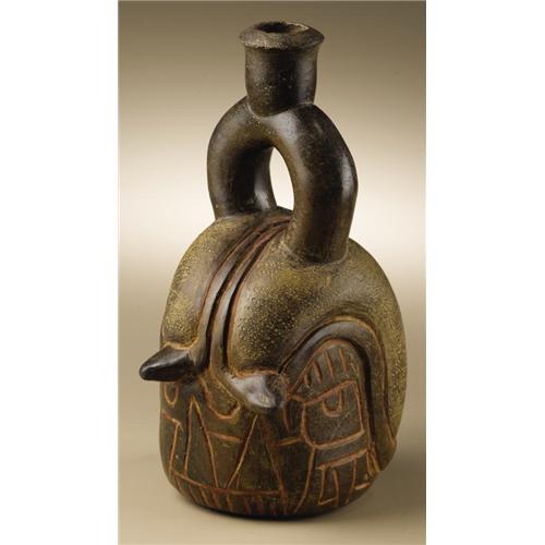 <B>Stirrup-spout Vessel: Head of a Mythical Creature</B></I><BR>Chavinoid<BR>600 - 400 B.C.<BR>Burnished gray ware, red pigment<BR>Height 9 in.<BR><BR>The unusual and somewhat puzzling iconography of this vessel suggests that it is either provincial in origin or very late in the Chavín-influenced sequence. The burnished areas of the vessel body are filled with a boldly-incised fanged head with large three-part eyes below striations possibly intended as eye lashes. A cap-like head-covering, divided down the center, ends in two outward-projecting points. The rest of the head area is lightly textured. The vessel settled during firing, which causes it to rest crookedly. The entire body of the vessel has been rubbed with red pigment. Overall condition is good, with minor pitting on the vertical spout and a clay sample drill hole in the base.<BR><BR>Provenance<BR>Bonhams & Butterfields, San Francisco: sale 7477E, 8 December 2003, Lot 3034 (p.15, ill., p.14)<BR><BR>