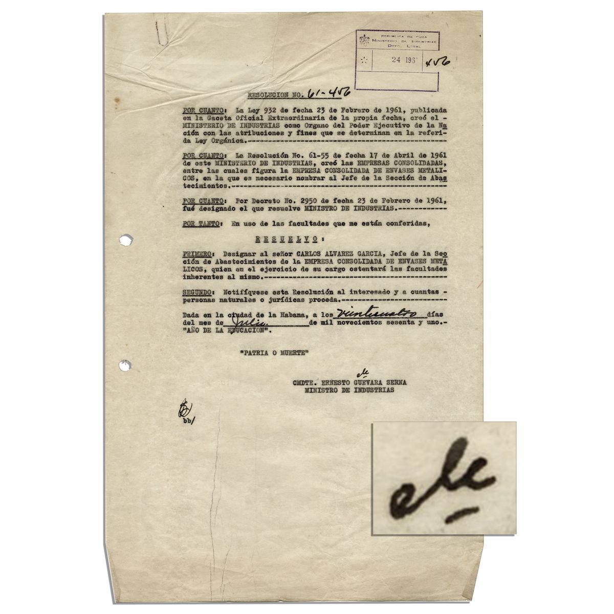 Che Guevara document signed as Minister of Industry, datelined Havana, 24 July 1961, just three months after the Bay of Pigs invasion. Document is a political resolution ''No. 61-456'' amending a previous law regarding the metal packaging industry. Spanish-language document appoints a Carlos Alvarez Garcia head of the Consolidated Metal Supplies packaging industry. Signed simply, ''Che'', as was his custom, above his title, ''Cmdte. Ernesto Guevara Serna / Ministro de Industrias''. Stamped with a Cuban Ministry of Defense seal. Single page typed document measures 8.5'' x 13'' on thin rice paper. Two punch holes and paperclip residue to top; creasing and toning throughout. Very good condition.
