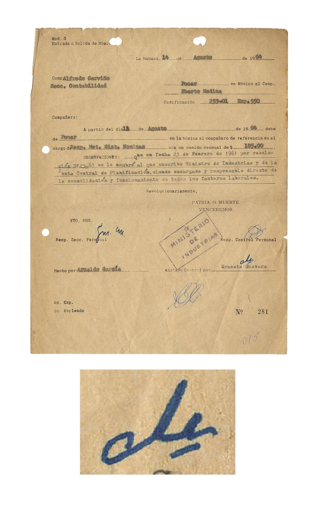 Che Guevara document signed ''Che'' from 14 August 1964, giving his approval for the hiring of someone at $185.00 per month. Document concludes with the closing, ''Revolucionariamente''. At this time, Guevara was emerging as a compelling statesman on the world stage; he gave an important speech at the United Nations later that year, calling for the end to apartheid in South Africa. Measures 8.5'' x 10.75''. Creasing, uniform toning, punch holes at top, and light chipping to margins. Overall in very good condition.