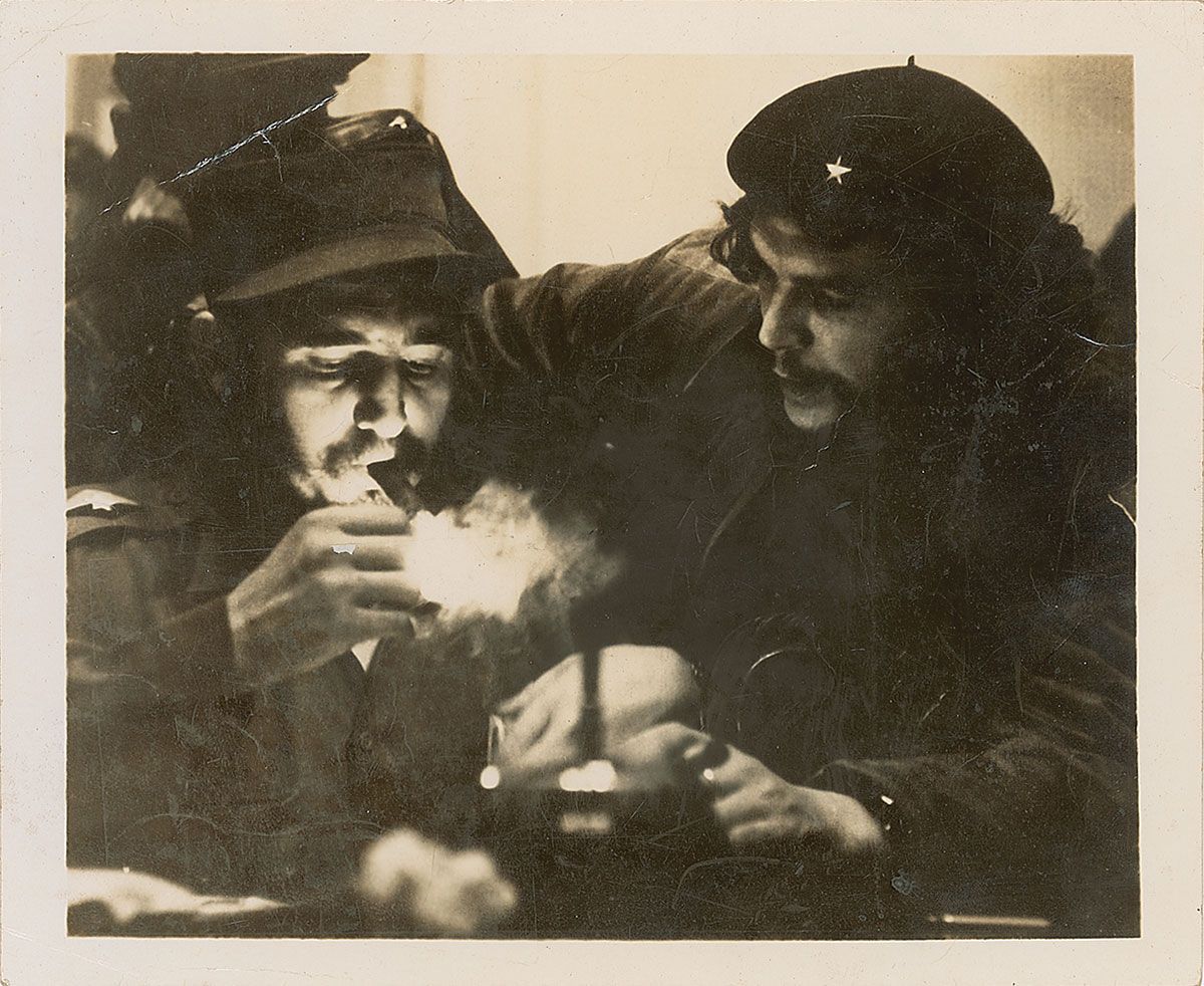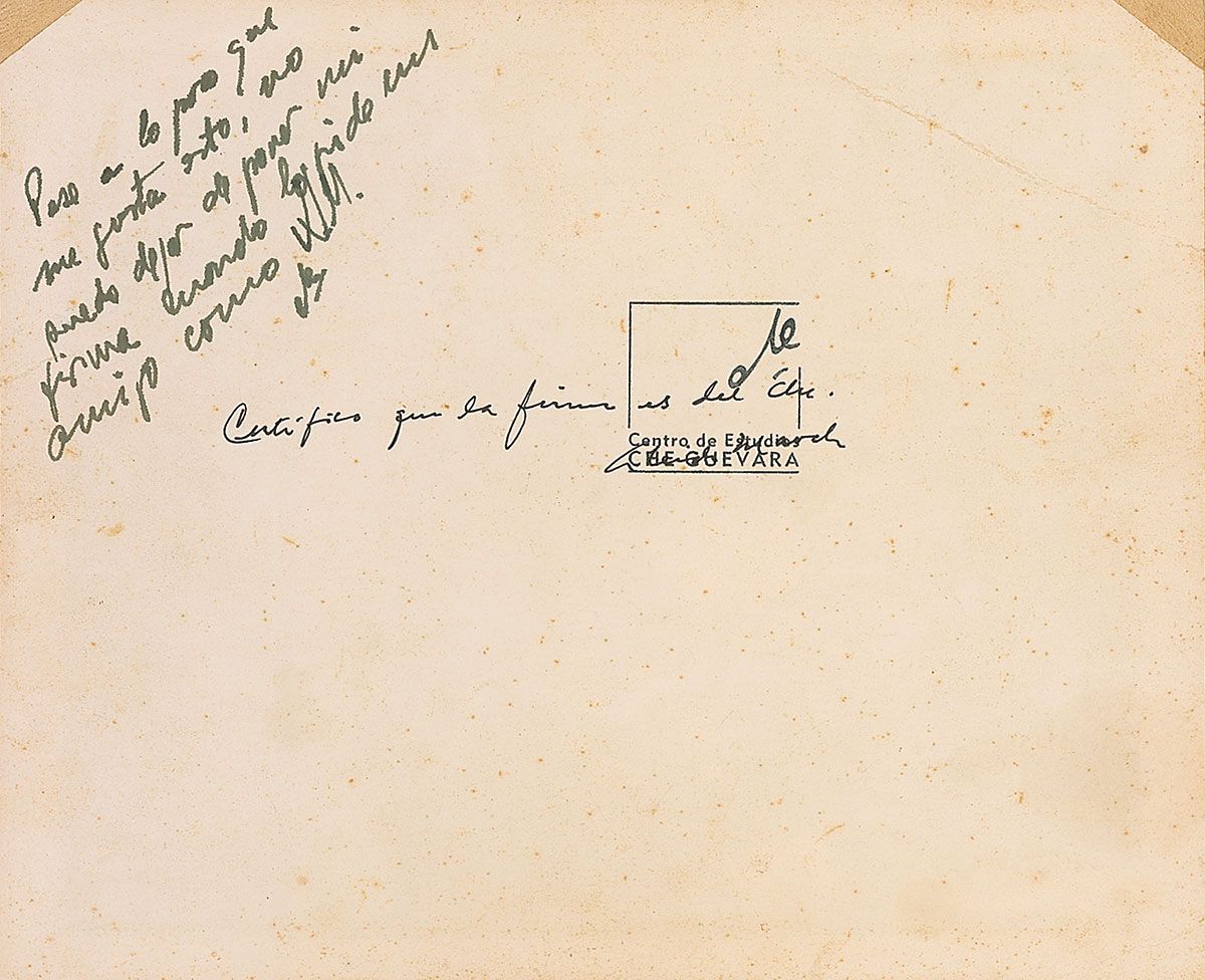 Vintage glossy 10 x 8 photo of Guevara, in his beret, and Fidel Castro lighting up a cigar, signed and inscribed on the reverse in black ink in Spanish (translated): “Although I don't like to do this, I can't refuse to give my signature when a friend like W. M. asks it of me. Che.” Authenticated in Spanish beneath the note: “Certify that the signature is of Che. Aleida March.” Over her signature is the stamping of “Che Centro de Estudios Che Guevara.” Aleida March was married to Che Guevara from 1959 until his death in 1967. She is the head of the Che Guevara Studies Center in Havana. Scattered creasing to image side, some scattered light foxing and creases to reverse, as well as two tape remnants to top corners, and a bit of light spreading of ink to signature and inscription, otherwise very good condition. Guevara signed photos of any size are extremely scarce. We know of no other signed photo that shows Che in his iconic beret or pictures him with Castro.
