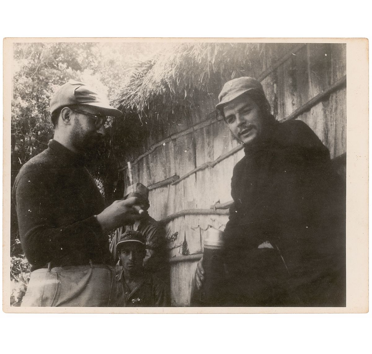 Extremely desirable glossy 9 x 7.25 photo of Guevara with some of his comrades, signed and inscribed in Spanish on the reverse in ink, (translated): “For guerrillas who love ‘Mate’ as a reminder of these experiences of exquisite taste, with strong fraternal affection and revolutionary comradeship. Che.” In fine condition, with light scattered creases and soiling, and a ballpoint notation in another hand to the left edge. This is not only an exceedingly rare format but also has a remarkable inscription—‘Mate’ is a traditional drink from Guevara’s native Argentina and brewed much like tea or coffee, often prepared and shared as a ‘drink of friendship.’ Mate was well-known as Guevara’s preferred drink and references to it are frequently found throughout his biographies. In fact, when he was born in 1928, his father had just established a plantation growing yerba mate—the plant dried and used to make the drink. With these close personal ties and the revolutionary sentiment expressed in the inscription, this is a positively fantastic signed photograph of the iconic Che.