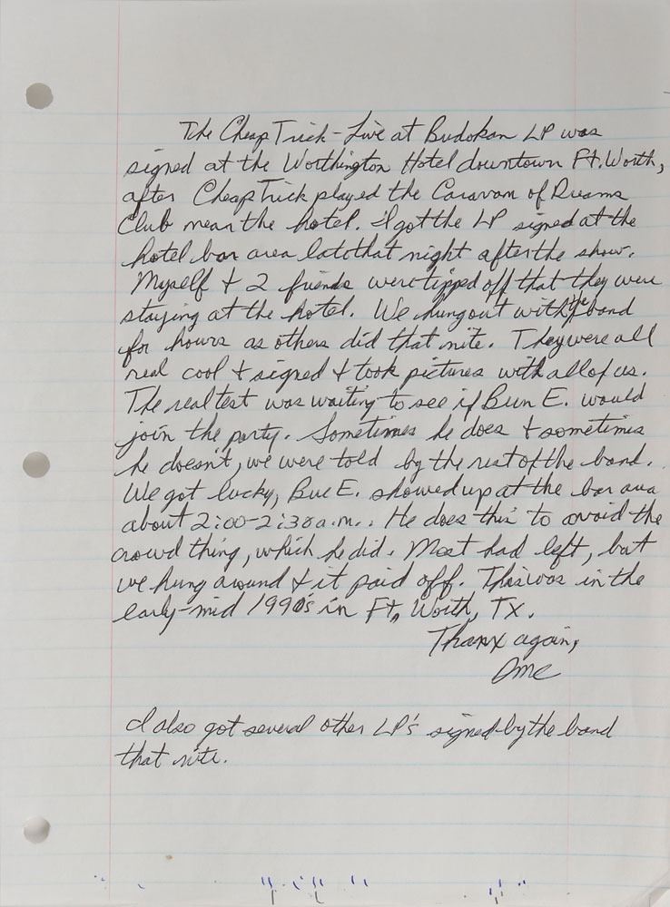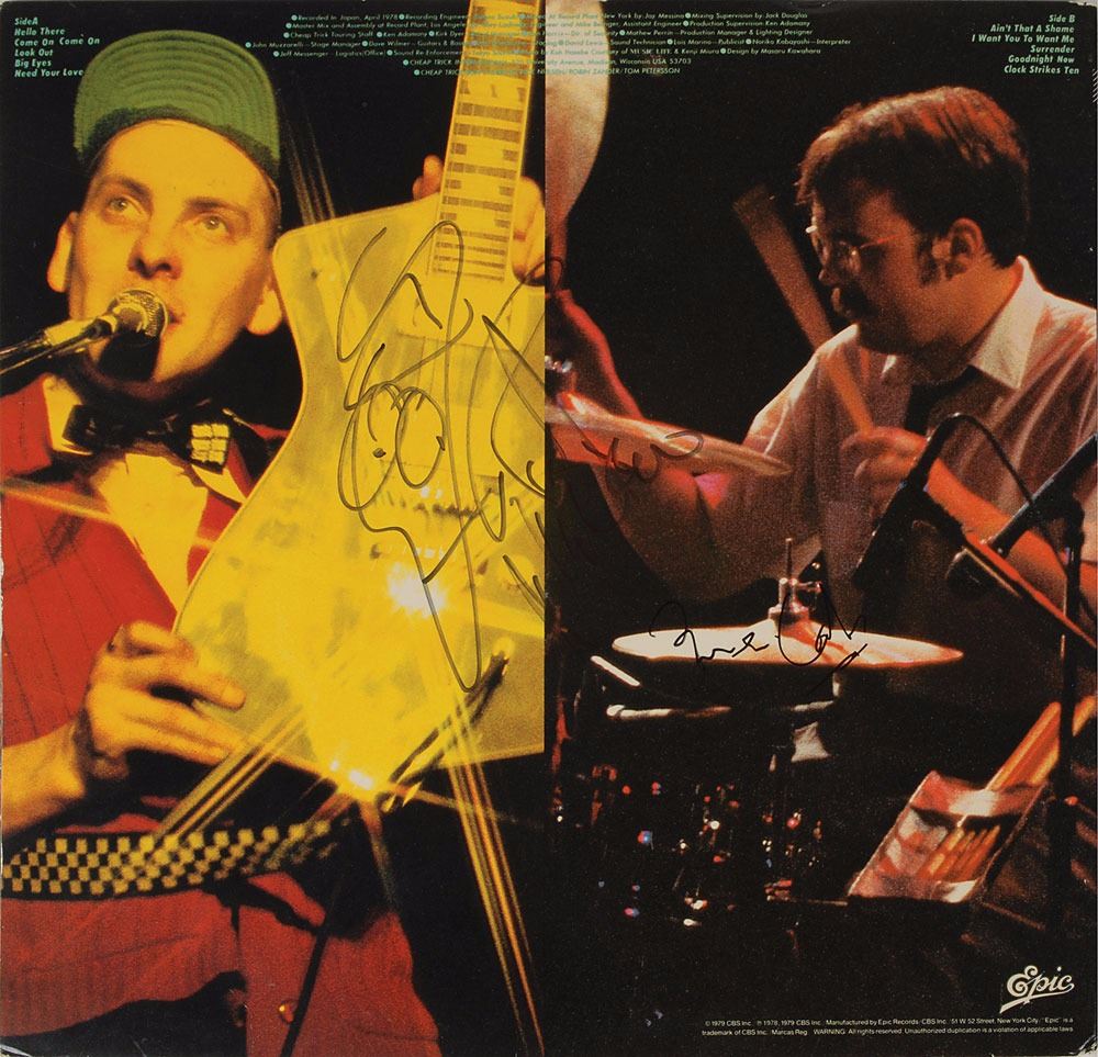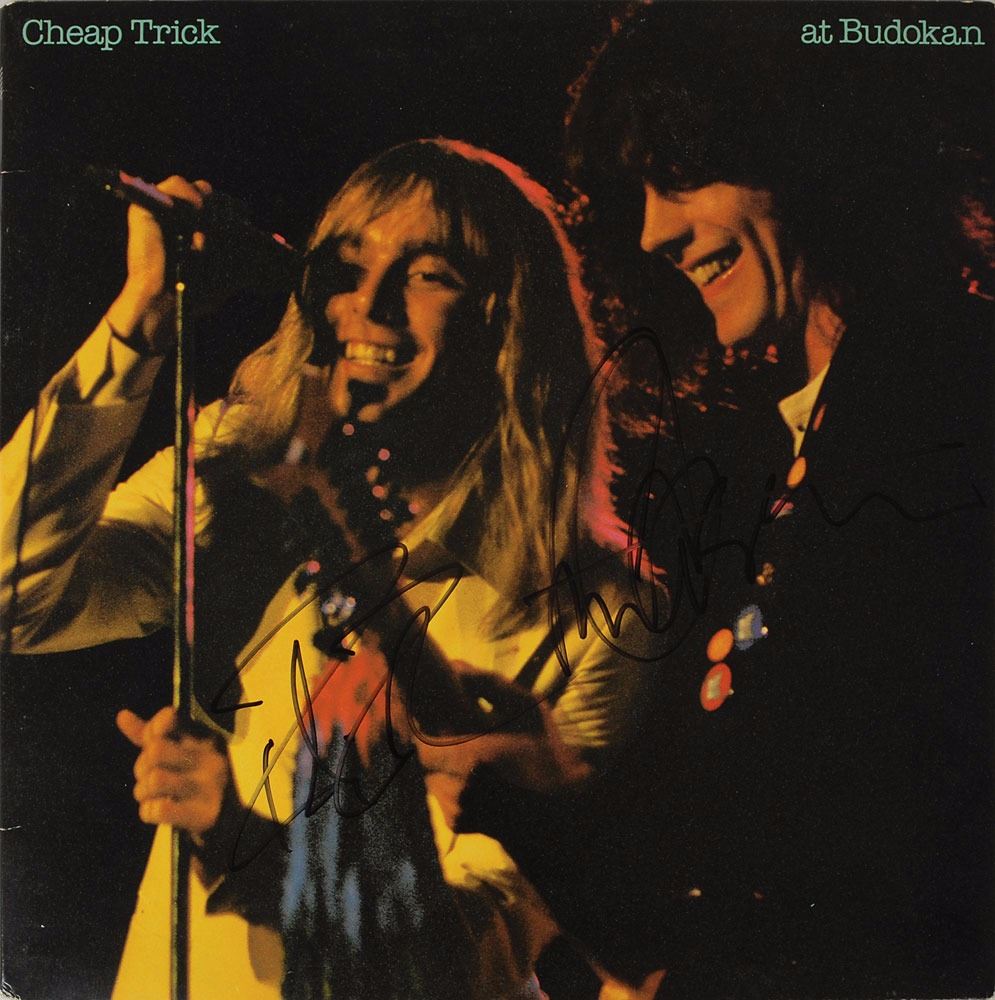 Cheap Trick at Budokan album signed on the front and back covers in black felt tip by Robin Zander, Rick Nielsen (adding a face), Tom Peterson, and Bun E. Carlos. In fine condition. The record is included. Accompanied by a letter of provenance from the original recipient, in part: "[The] LP was signed at the Worthington Hotel downtown Ft. Worth, after Cheap Trick played the Caravan of Dreams Club near the hotel. I got the LP signed at the hotel bar area late that night after the show." An ideal Cheap Trick display piece. Pre-certified REAL.