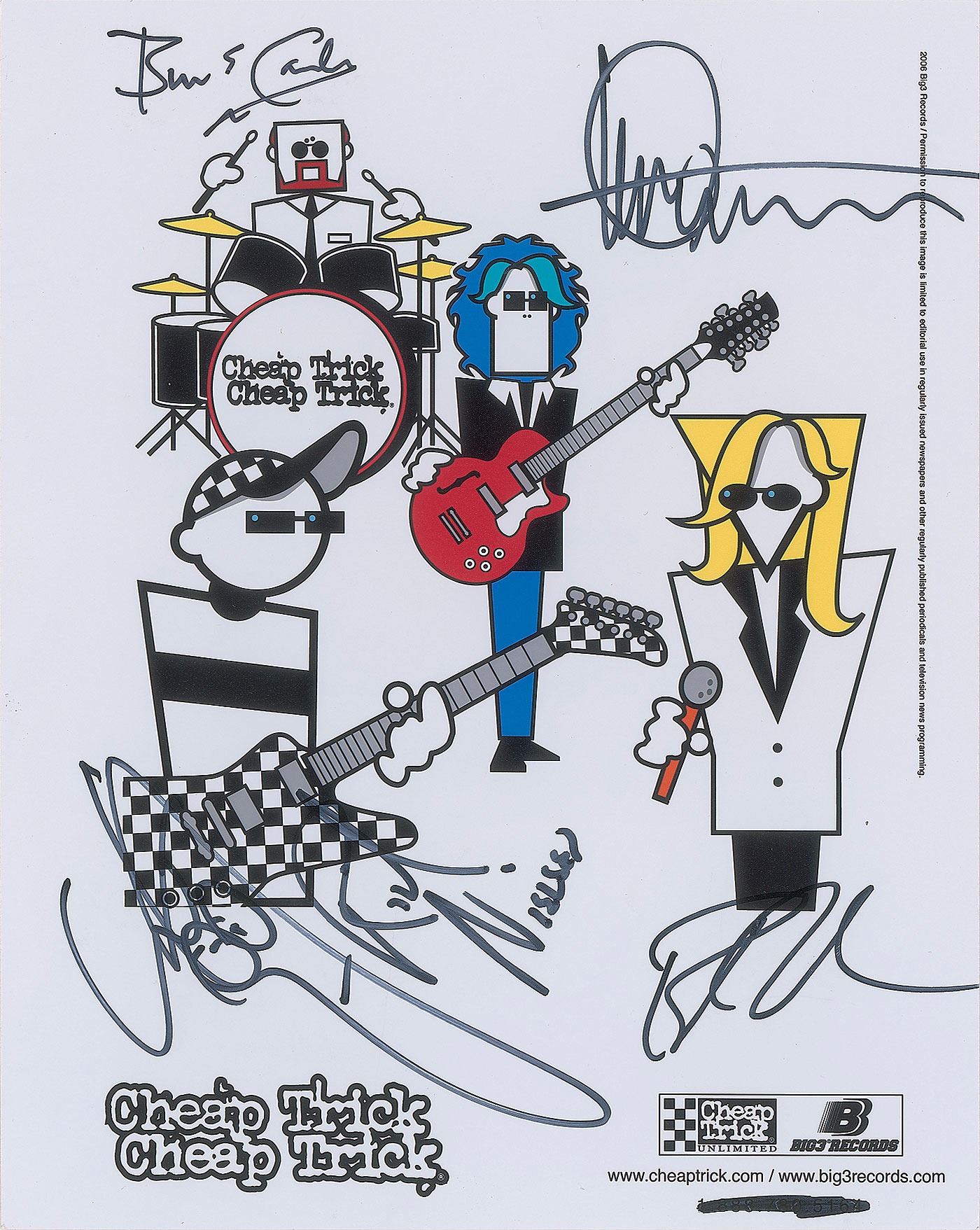 Color semi-glossy 8 x 10 Big3 Records publicity photo showing Cheap Trick as cartoon figures, signed in black felt tip by Robin Zander, Tom Petersson, Bun E. Carlos, and Rick Nielsen, who adds a face. In fine condition.
