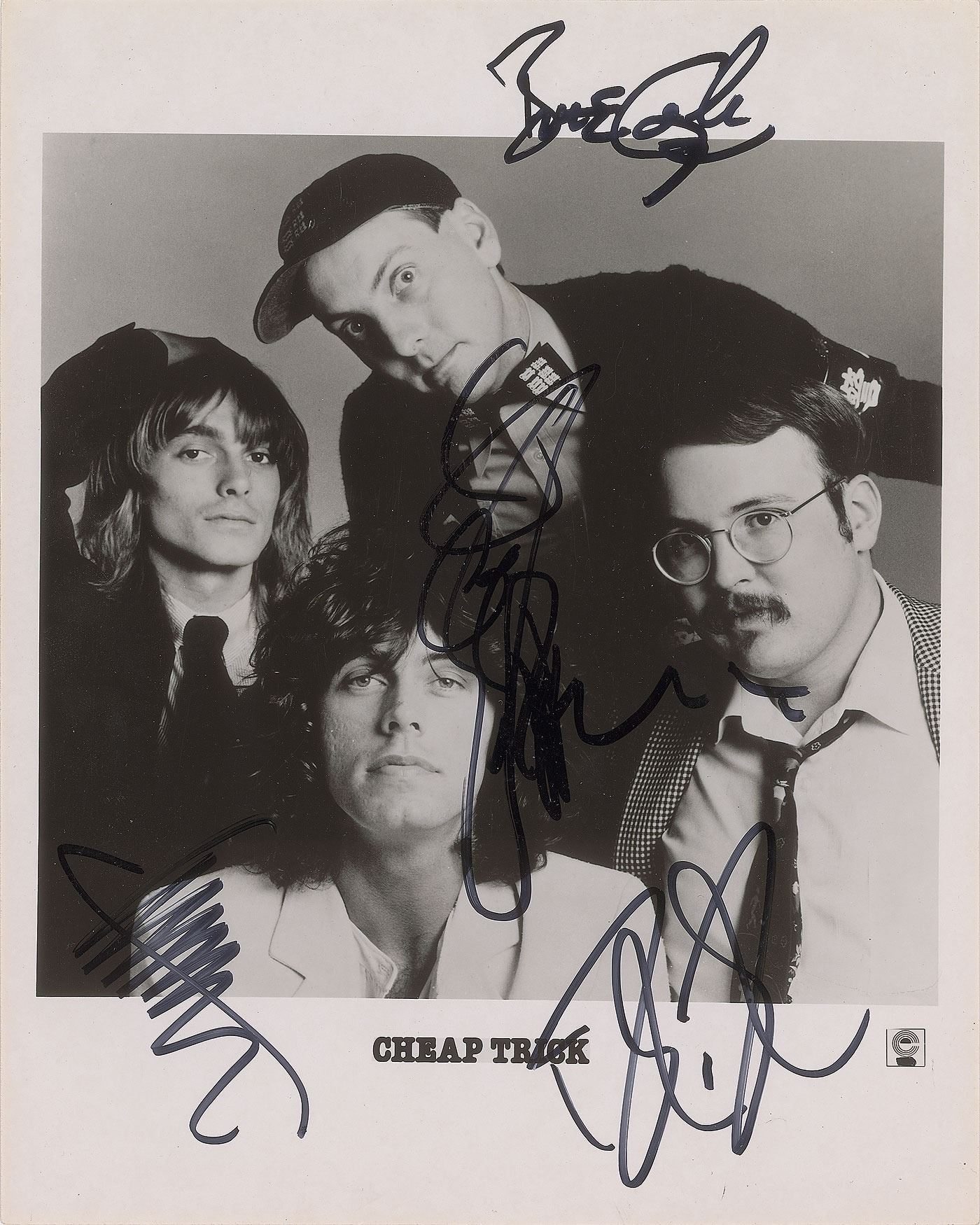 Glossy 8 x 10 publicity photo of Cheap Trick, signed in black felt tip by Robin Zander, Tom Petersson, Bun E. Carlos, and Rick Nielsen. In fine condition.