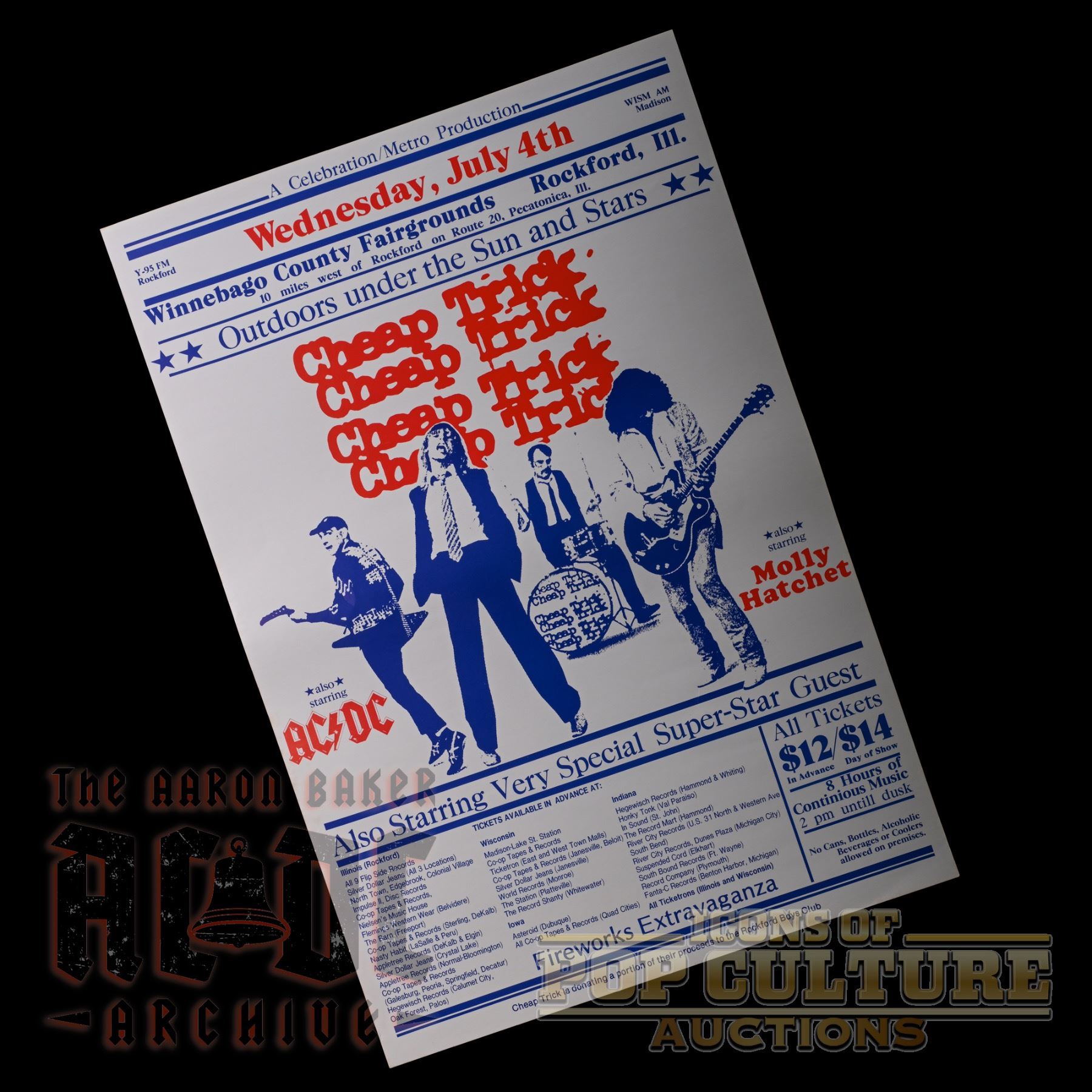 This is a 25" × 17" concert poster promoting a July 4th outdoor show at the Winnebago County Fairgrounds in Rockford, Illinois, headlined by Cheap Trick with special guest AC/DC and Molly Hatchet. Presented as part of a Celebration/Metro production, the poster highlights the Independence Day event with bold red and blue graphics, featuring an image of Cheap Trick and prominently displaying AC/DC as part of the lineup. The poster also notes a full day of music, fireworks, and festivities, with ticket prices listed at $12 in advance and $14 at the gate. This piece represents a rare artifact from AC/DC’s late 1970s touring history in the United States, capturing a moment when the band shared the bill with fellow hard rock heavyweights.