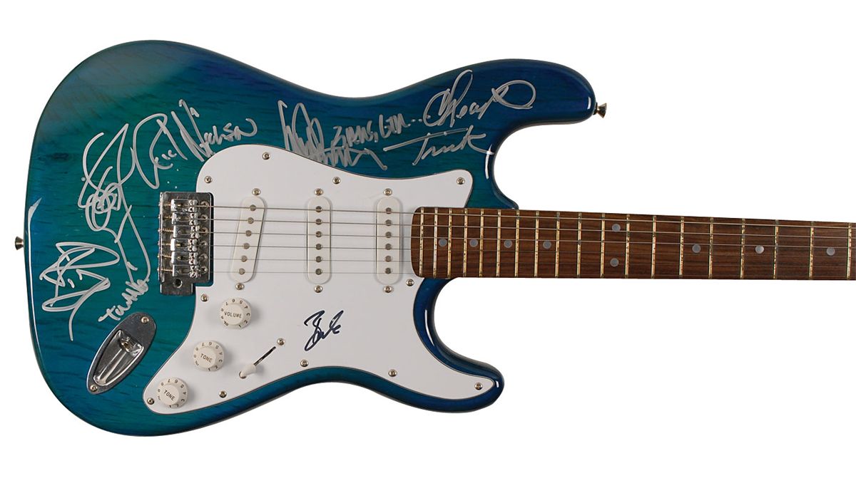 Green-bodied Cleca ‘stratocaster-style’ electric guitar, signed on the body in silver ink by Robin Zander, Rick Nielson, and Tom Petersson, and on the white pickguard in black felt tip by Bun E. Carlos. In fine condition, with pickguard partially obscuring the bottom of one signature. Oversized.