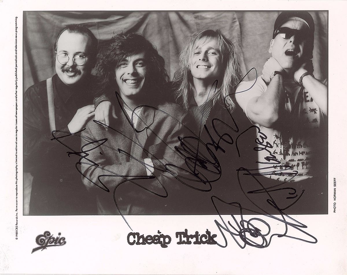 Glossy 10.25 x 8 Epic publicity photo of Cheap Trick, signed in black felt tip by Robin Zander, Tom Petersson, and Rick Nielsen. In fine condition.