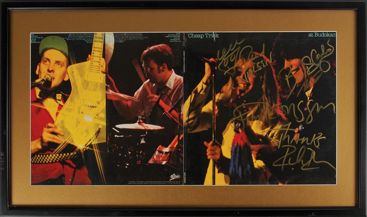 Cheap Trick at Budokan album signed on the front cover in gold ink, “Thanks, Robin Zander,” “Bun E. Carlos,” “Tom Petersson,” and “Rick Nielsen,” who adds a small face. Matted and framed to an overall size of 29.25 x 17.25. In fine condition, with a discount cut at the top edge.