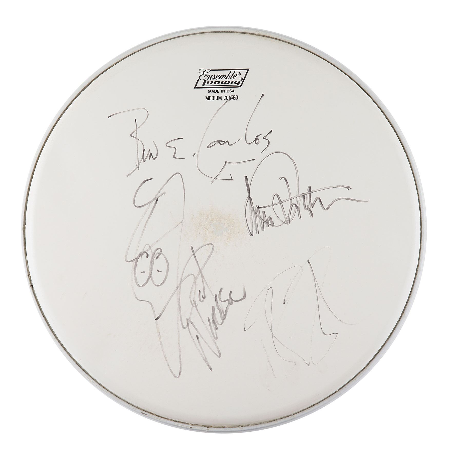 Awesome off-white medium coated Ludwig Ensemble drum head used on Cheap Trick's 2008 tour by drummer Bun E. Carlos, measuring 14.75? in diameter, signed in black felt tip by Carlos, Robin Zander, Tom Petersson, and Rick Nielsen, who adds a self-caricature sketch. In fine condition, with expected signs of use. Consignor notes that the drum head was sold on the band's site following their 2008 concert run.