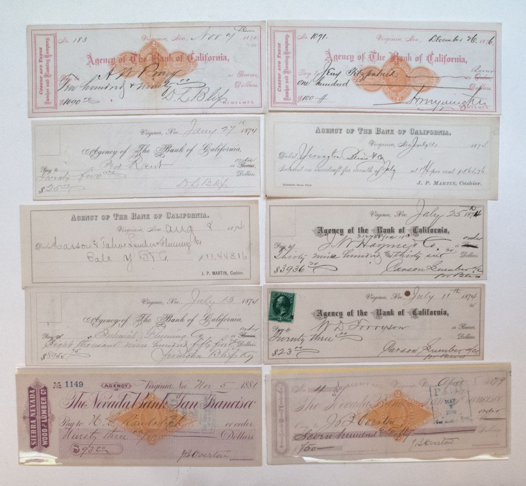 LAKE TAHOE RELATED CHECKS, 1874-1881, LOT OF 10: 1) Carson & Tahoe Lumber & Fluming Co., 1874,RN-D1, signed by Bliss. 2) Sierra Nevada Wood & Lumber Co., 1879,RN-G1, signed by Overton. 3) Carson & Tahoe Lumber & Fluming Co., 1876,RN-D1, signed by Yerington. 4) Bank of California, V.C., 1874, signed by Bliss. 5) Sierra Nevada Wood & Lumber Co., V.N., 1881,RN-G1, signed by Overton. 6) Bank of California, V.N., 1874, signed by Yerington Bliss & Co. 7) Bank of California, V.N., 1874, signed Carson Lumber Co. 8) Bank of California, V.N., 1874, made out to Carson & Tahoe Lumber & Fluming Co. 9) Bank of California, V.N., 1874, made out to Yerington Bliss & Co. 10) Bank of California, V.N., 1874, 3 cent green Wash.Rev. stamp, signed Carson Lumber Company.- History of Yerington, Overton and Bliss.- "D.L. Bliss" President & General Manager of the Carson Tahoe Lumber & Fluming Co, 1872.- "H.M. Yerington" Born in Canada In 1828. Came to Nev. In 1863, he was President of 16 different companies at one time. Best known as General Supert.& Vice President of the V.& T. R/R Co., & Construction Supert. & Pres., of the Carson & Colorado R/R Co.- "J.B. Overton", Supert. of Virginia & Gold Hill Water Co.City: Lake TahoeCounty: State: NV