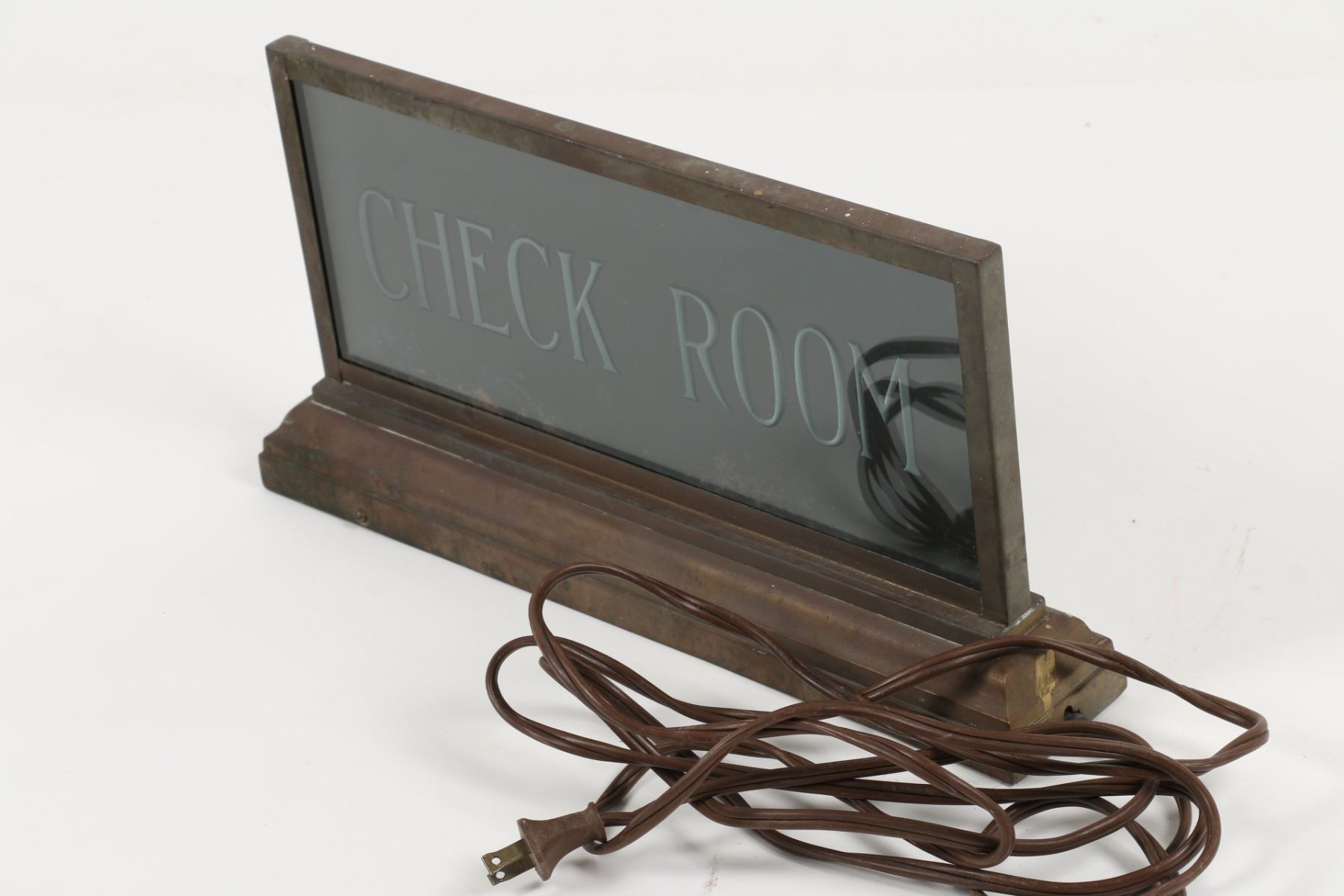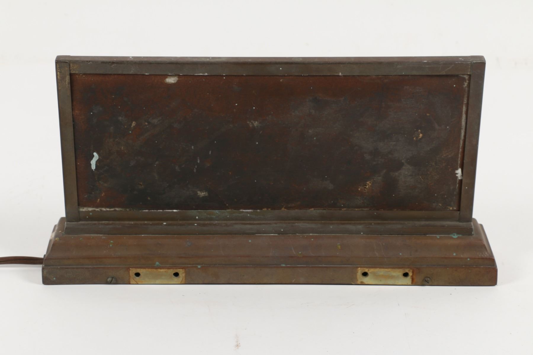 Circa 1930. Lighted etched glass panel set within copper case. 16" x 8" x 3". Case tarnished. Re-wired. Illuminates. $200-300.