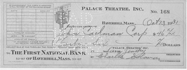 CHARLES SOLOMON Solomon was a Prohibition-era bootlegger and head of an organized crime syndicate. He weas present at the first major gangster conference in Atlantic City in 1929 and was assassinated in 1933. DS. 1 page. 8 1/4" x 3". Haverhill, Mass. Oct. 13, 1931. Partly-printed bank check drawn on The First National Bank of Haverhill, Mass. payable to John Cashman Corp in the amount of $46.00. Accomplished in a secretarial hand and signed by Solomon. Usual bank punch cancellations not affecting signature. Excellent.