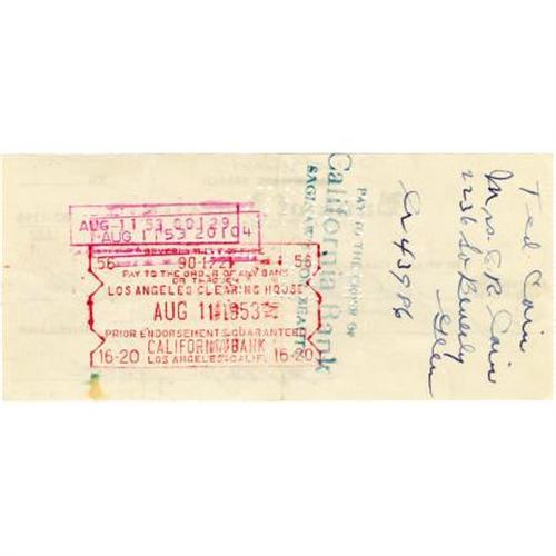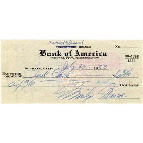 <B>Marilyn Monroe Signed Check Made out Entirely in Her Hand</B></I> DS "<I>Marilyn Monroe</B></I>", 5.75" x 2.5", July 23, 1953, drawn on the Bank of America and made out to "<I>Ted Carin</B></I>" in the amount of $6.00. Faint traces of dampstaining affect the bottom of the "<I>M</B></I>" in Monroe, otherwise a fine example as the cancellation stamp is well away from the signature.<BR><BR><b>Shipping:</b> Flat Material, Small (<a target="_blank" href="http://www.heritageauctions.com/common/shipping.php">view shipping information</a>)