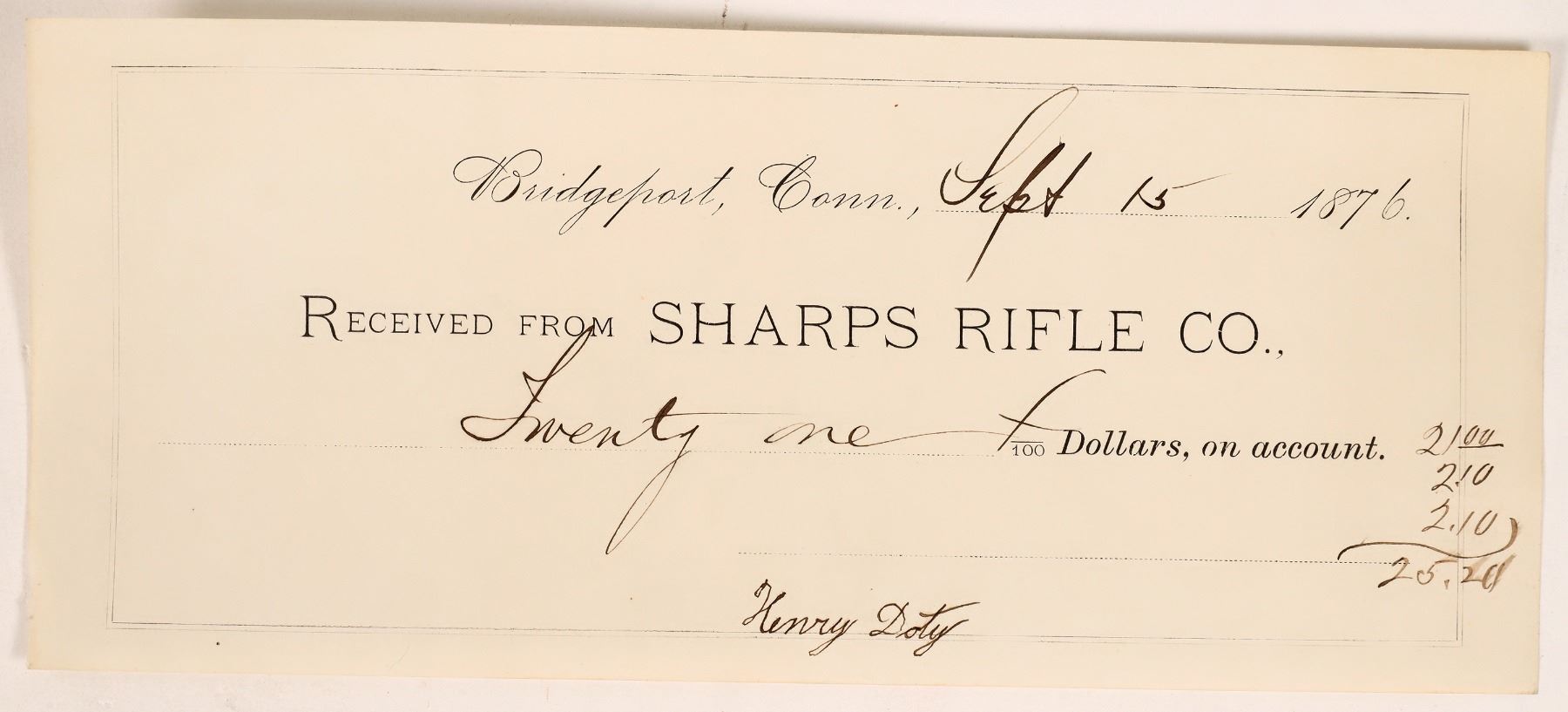 This check is written from the Sharps Rifle Company to a Henry Doty in 1876 for $21.00. This was the first year of the Sharps Rifle Co. in Bridgeport, Connecticut. 3.5 in. X 8 in. In excellent condition. Please see photo for details.