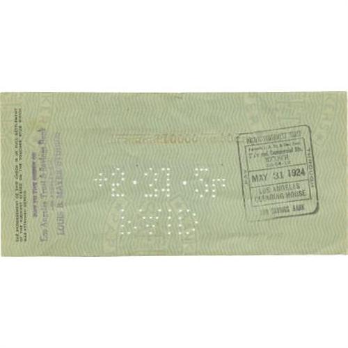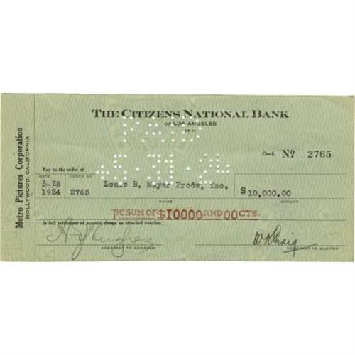 <B>Rare Goldwyn Purchase Check that Created MGM.</B></I> This check for $10,000 from Metro Pictures to Louis B. Mayer, dated May 28, 1924, allowed Metro to purchase a controlling interest in the company; with the acquisition of Goldwyn Studios later that same year, MGM Studios was formed. This check represents part of the purchase of one of the greatest movie studios ever formed, and is one of only five checks known to exist from the transaction. In Very Fine condition with minor wear, mild discoloration, and the usual bank cancellation marks. <I>Accompanied by LOA from PSA/DNA.</B></I><BR><BR><b>Shipping:</b> Flat Material, Small (<a target="_blank" href="http://www.heritageauctions.com/common/shipping.php">view shipping information</a>)