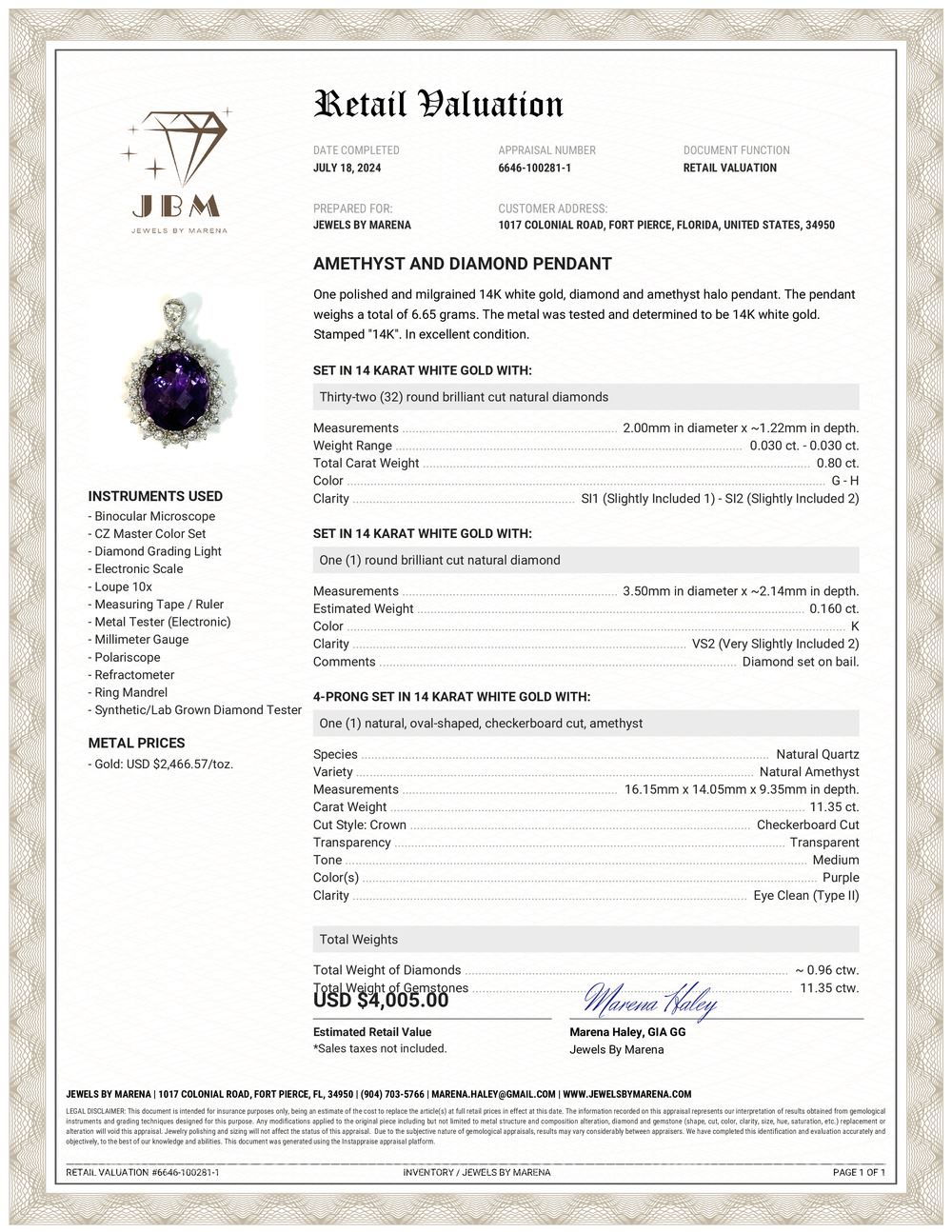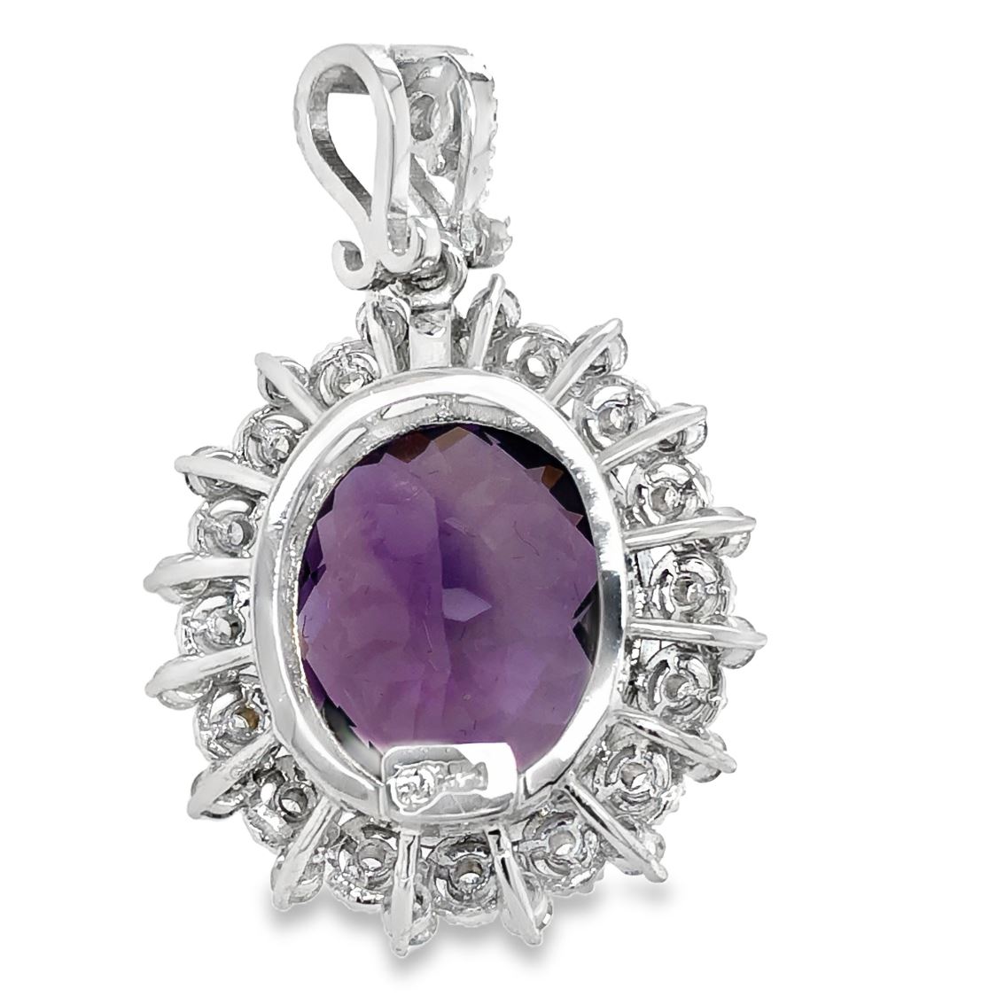 DESCRIPTION DETAIL: A stunning pendant showcasing a checkerboard cut Amethyst surrounded by a double halo of natural round brilliant cut Diamonds in milgrained 14K White Gold.