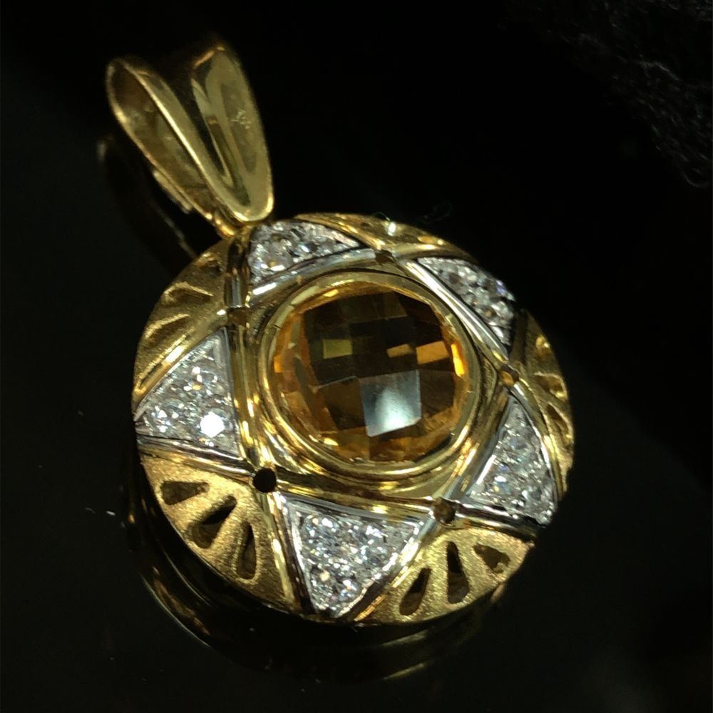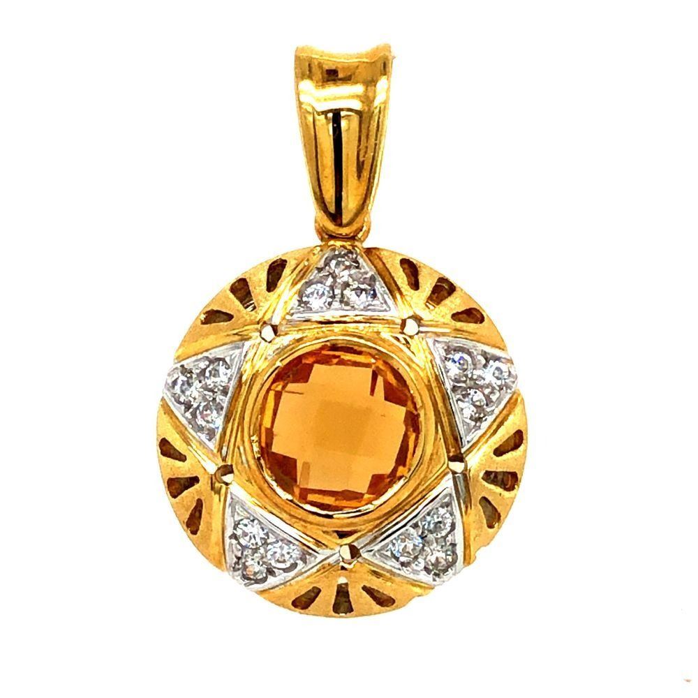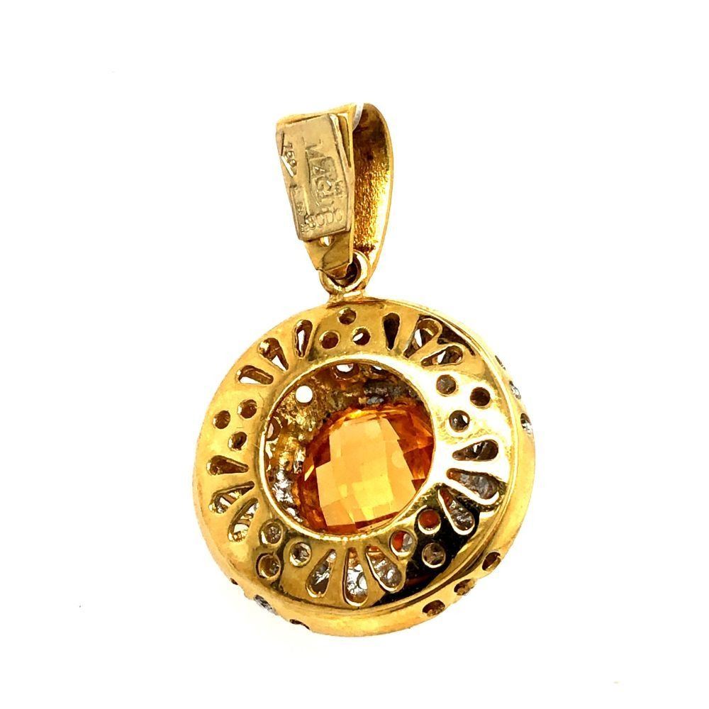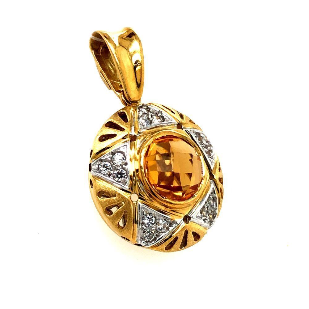 Genuine Citrine and Earth-Mined Diamond Pendant.& nbsp; This is an 18 karat yellow gold pendant that features an approximate 1.50 carat round, bezel-set checkerboard faceted golden-yellow citrine with approximately .20 carats of round, brilliant-cut, near colorless, SI clarity diamonds in a star pattern around the 3D pendant.& nbsp; This pendant is approximately 3/4& quot; in diameter and 9 mm thick.& nbsp; The front of the pendant is domed with reticulated design and a frosted finish. The pendant has a reticulated open back for stability.& nbsp; The bail is soldered and large enough for up to a 4 mm chain.& nbsp; This is a preowned, estate item in excellent condition.