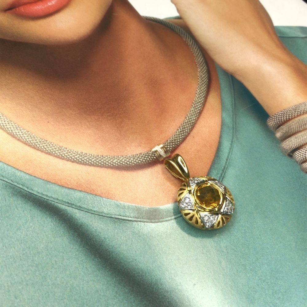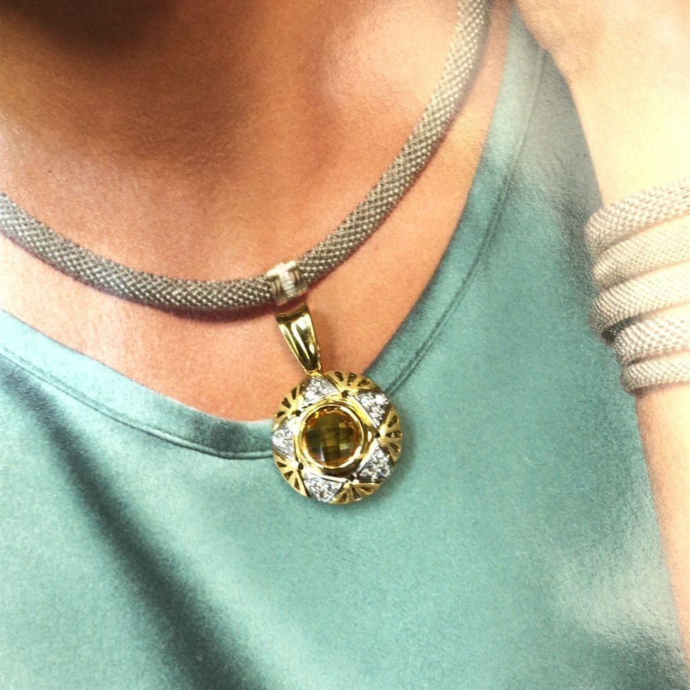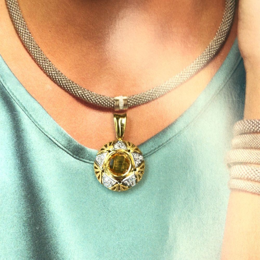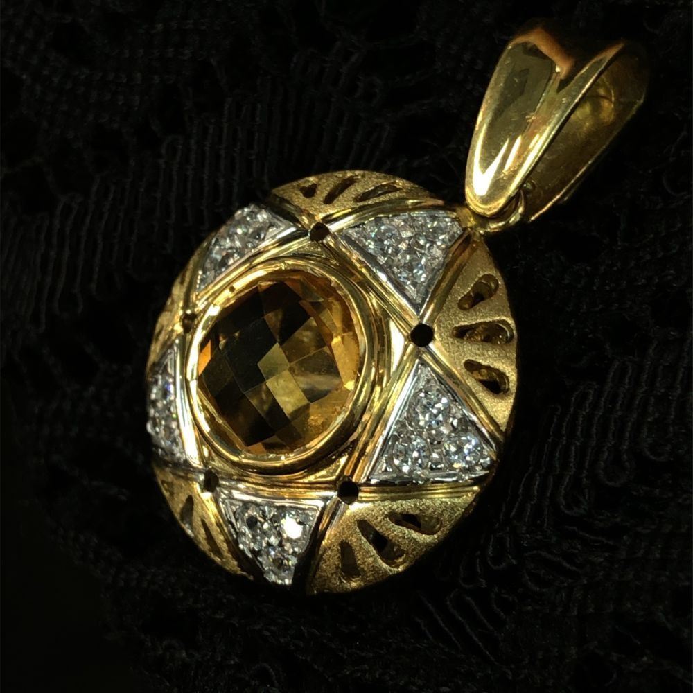 Genuine Citrine and Earth-Mined Diamond Pendant.& nbsp; This is an 18 karat yellow gold pendant that features an approximate 1.50 carat round, bezel-set checkerboard faceted golden-yellow citrine with approximately .20 carats of round, brilliant-cut, near colorless, SI clarity diamonds in a star pattern around the 3D pendant.& nbsp; This pendant is approximately 3/4& quot; in diameter and 9 mm thick.& nbsp; The front of the pendant is domed with reticulated design and a frosted finish. The pendant has a reticulated open back for stability.& nbsp; The bail is soldered and large enough for up to a 4 mm chain.& nbsp; This is a preowned, estate item in excellent condition.