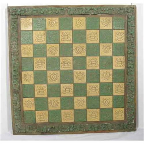 The board measures 20" X 20" on the outside and the playing "field" measures 16" X 16" on the inside. Made of plywood and applied gesso decoration, as used in picture frames. Heavy (10lbs) Great decoration piece for a games room.