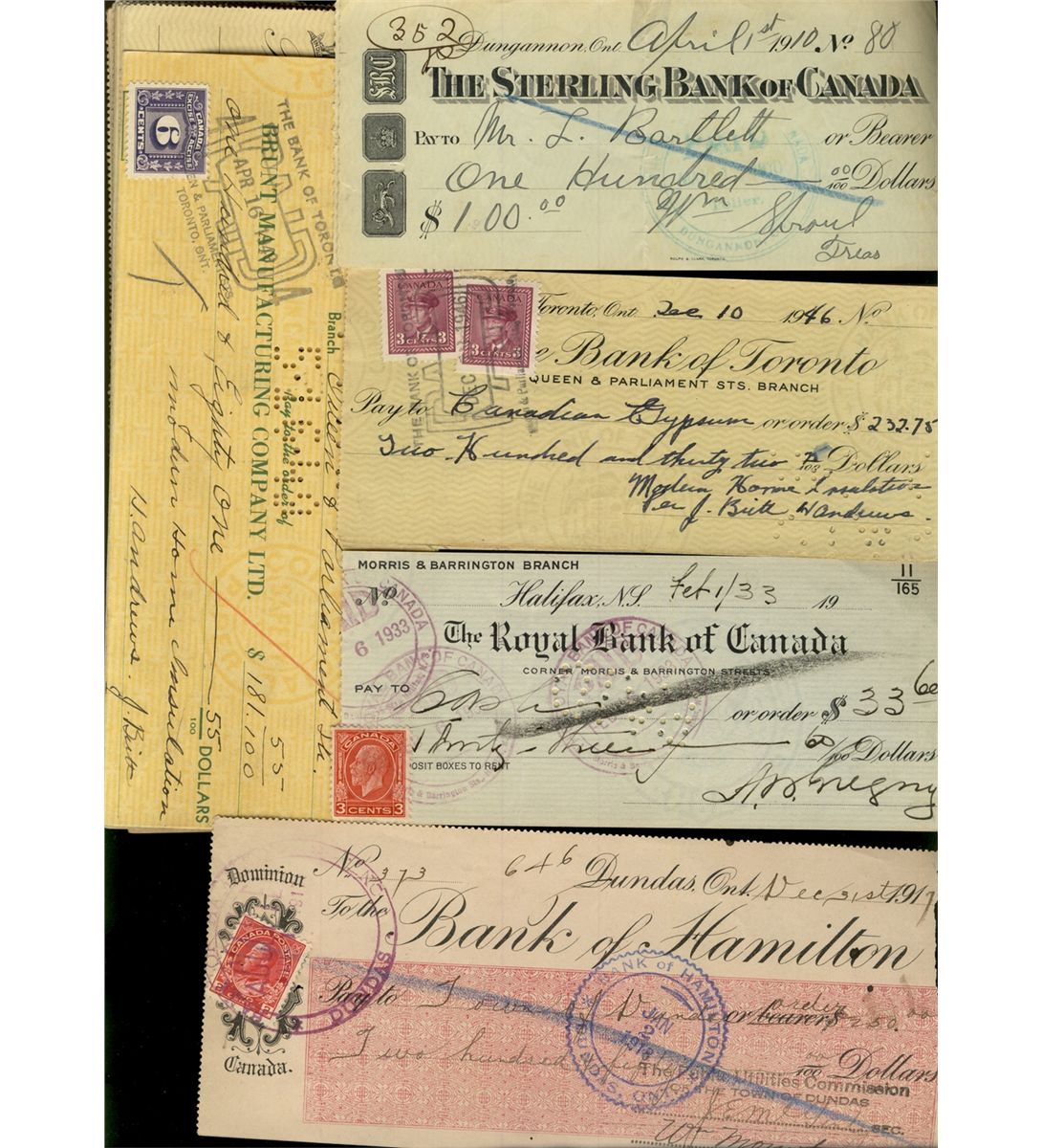 Checks; includes 32 old cancelled checks from the Banks of Toronto and The Royal Bank of Canada with dates ranging from 1930-1951.